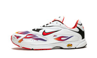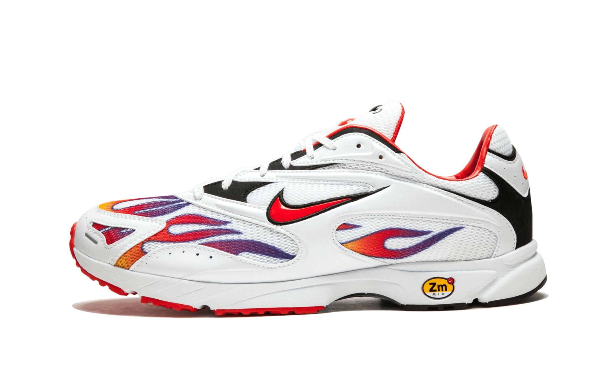 Things heated up for this Supreme and Nike collaboration in 2018. The two brands resurrected the Air Streak Spectrum Plus, which was originally a performance road racing sneaker from 2003. Supreme breathed new life into the silhouette, incorporating fiery graphics across the mesh upper. This Supreme x Nike Zoom Streak Spectrum Plus "White/Habanero Red" is one of two colorways, and has yellow, red, and blue flames.