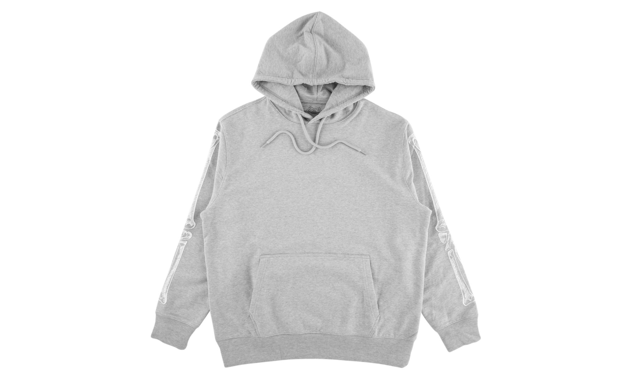 The Palace Bones Hood introduces another sweatshirt with classic pullover styling. Spun in a neutral color, the grey cotton long sleeve is made of 100% cotton. It’s got elasticated cuffs, a drawstring hood to keep your head warm, and kangaroo pockets. Finishing off the sweatshirt design are skeletal bones in white, which run the length of each sleeve from the shoulder to the wrist.