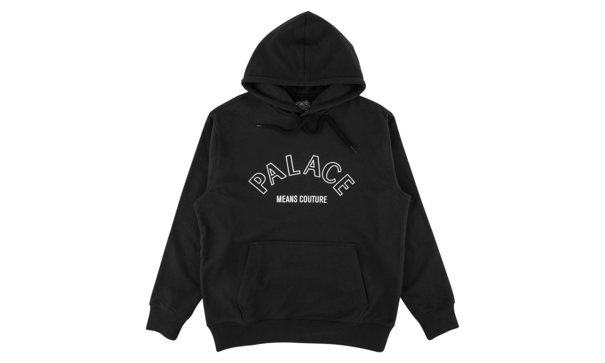 The Palace Couture Hoodie in Black is a premium hooded sweatshirt by the London-based skateboard and streetwear brand. The design is a riff on the classic Versace “Jeans Couture” logo. The hoodie features a heavyweight fleece build in black with the graphic contrasting in white. The black Palace Couture Hoodie was a popular piece from the Palace Summer 2018 line.