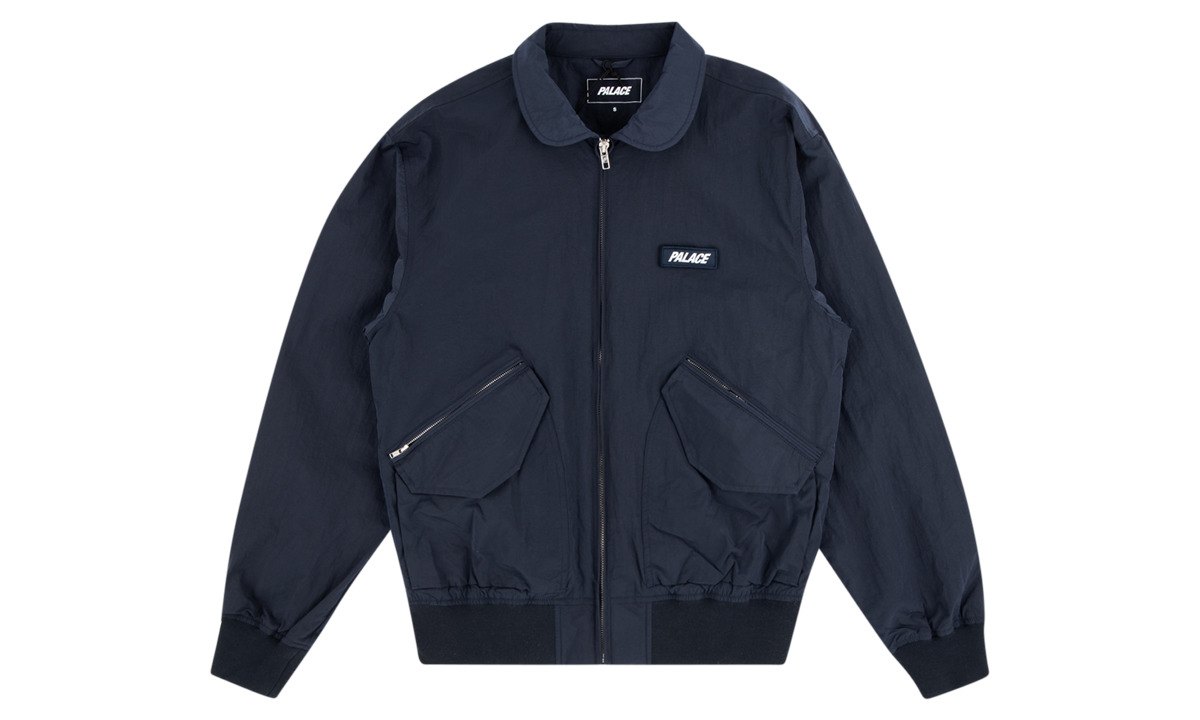 The Palace F-Light Jacket is a classic sports-inspired layer. Made in navy blue, the long sleeve nylon jacket has a roomy fit with sleeves and a body that gather at the cuffs and hemline. Subtle color blocking is seen where lighter shades of navy take on the collar, pocket details, and a side of one of the sleeves. The Palace F-Light Jacket was showcased in the brand’s Summer 2018 collection lookbook, which was set in a summery desert landscape and modeled by Palace skaters Blondey McCoy and Lucien Clarke.
