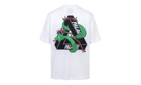 The Palace Hesh Mit Fresh T-Shirt from Palace's Spring/Summer 2020 collection will be the perfect foundation for your outfit or a solid base layer to whatever you put on top of it. This short sleeve cotton T-shirt in white is punctuated with a tattoo-inspired graphic of barbed wire and a coiled snake wrapped around the Palace Tri-ferg logo. The colorful branding is found on the chest and on the back in a larger version.