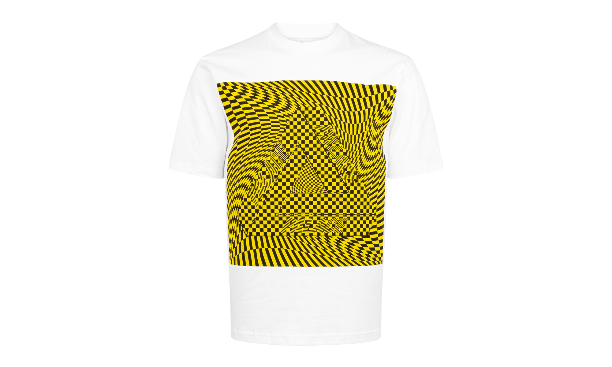 The Palace Mash Eye T-shirt “Navy” is an essential streetwear piece for those who enjoy loud graphic tees. Released during the skateboarding company’s Winter 2019 season, the T-shirt harkens back to a time during ‘90s-era streetwear when trippy graphics dominated the scene. Here, contrasting yellow and black makes up a jagged, dizzying motif on the front of the white tee with a black Tri-Ferg logo layered underneath.