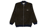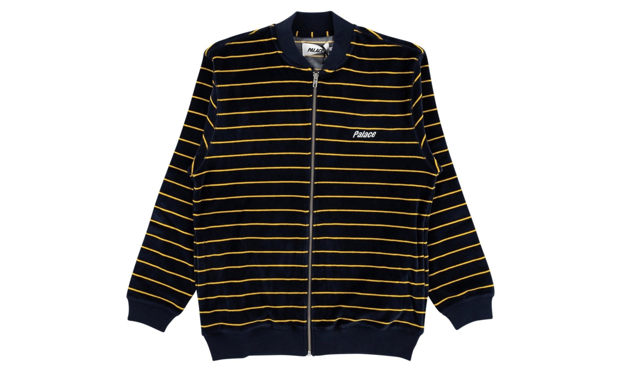 The Palace Velour Bomber is a sweatshirt that resembles a bomber jacket. Perfect for day or night, the zip-up layering piece is navy with a yellow horizontal striped pattern. The elasticated cuffs, collar, and hemline are solid grey. Boasting a velour feel, this Palace Velour Bomber is made up of 80% cotton and 20% polyester. Fashion history tip: Velour was originally made popular in the late 1970s and many remember a resurgence when Tony Soprano wore a velour tracksuit religiously on The Sopranos.