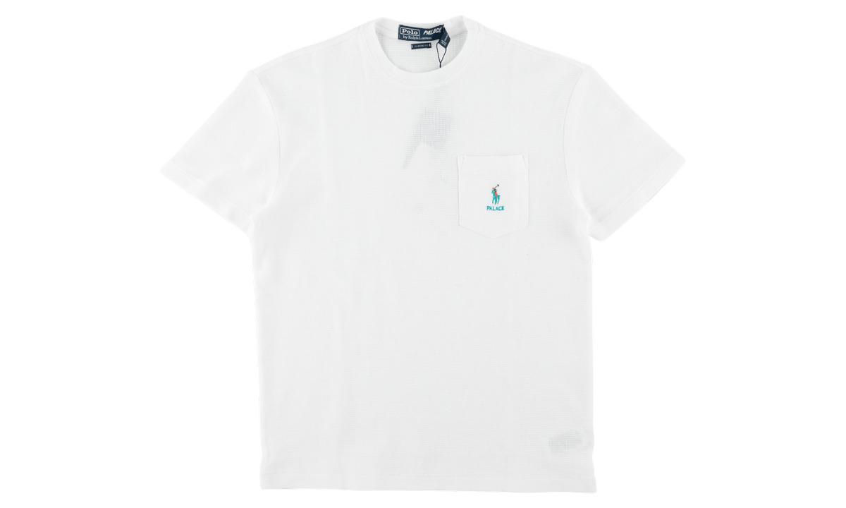The Polo x Palace Waffle Pocket Tee in Pure White is an essential item from the epic 2018 collaboration between the London-based skateboard brand and Ralph Lauren's iconic American apparel label. This premium short sleeve pocket t-shirt design is constructed with a white waffle textured fabric with a classic fit. A dual-branded logo featuring the Polo pony above Palace text is embroidered on the pocket in vibrant shades of teal and orange to complete the design.