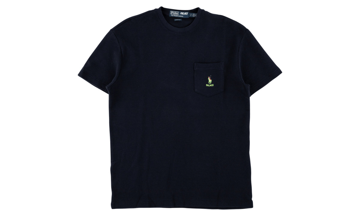 The Polo x Palace Waffle Pocket Tee in French Navy was among the most sought after pieces from the highly publicized 2018 collaboration between the England-based skateboard and streetwear brand and the iconic apparel label from Ralph Lauren. This short sleeve pocket t-shirt is built with a heavyweight waffle textured fabric in a classic fit for a premium look and feel. A dual logo featuring the Polo pony above Palace text is embroidered on the pocket in bright yellow and orange hues for a unique appearance.