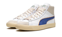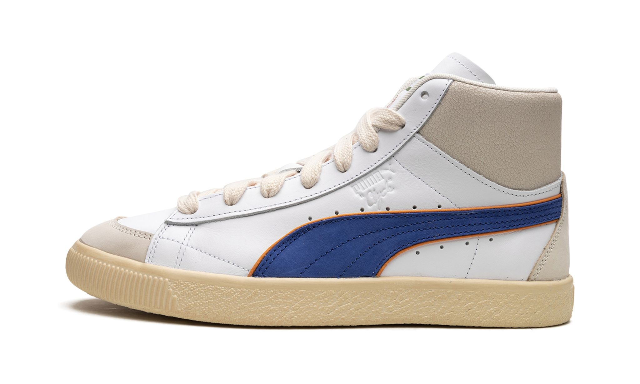 The Rhuigi x Puma Clyde Mid “White/Royal” is a collaboration between Rhuigi Villaseñor and Puma on the mid-top version of the retro basketball shoe. Rhuigi and Puma’s Clyde Mid in “White/Royal” celebrates Clyde Frazier’s old school signature shoe as well as the New York Knicks, Clyde’s former team, by featuring its colors on its design. More specifically, the shoe features a white leather construction with a contrasting blue Puma logo with orange trim on the side. Debossed “Puma” branding is found below the eyelets. Co-branding is found on the tongue tag. Release date: May 26, 2023