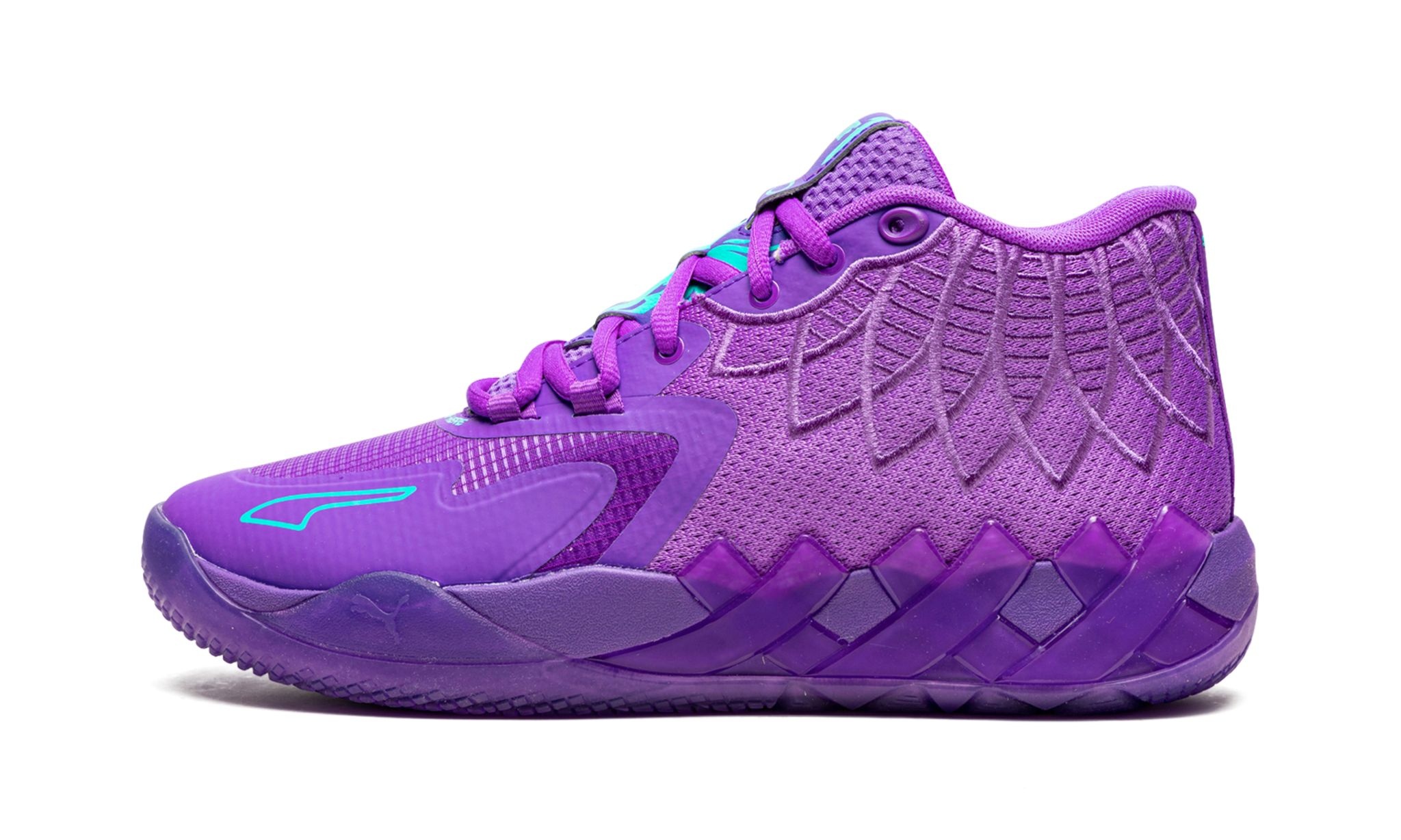 The Puma MB.01 “Queen City” is a head-turning colorway of LaMelo Ball’s first signature shoe that salutes the team uniform colors of the Charlotte Hornets. Ball, the Hornets rising superstar point guard, quickly made a name for himself in the NBA by leading the Hornets to the team’s first NBA Playoffs appearance since 2015 in 2022. As for this shoe, the upper is constructed in a Purple Glimmer basketball jersey-like mesh material from the midfoot to the heel. The front of the shoe features a mesh textile. Unique “1 of 1” branding is found in bright blue on the tongue. The grooved outsole provides traction on the court, and assists with hard cuts, starts and stops. Release date: March 13, 2022