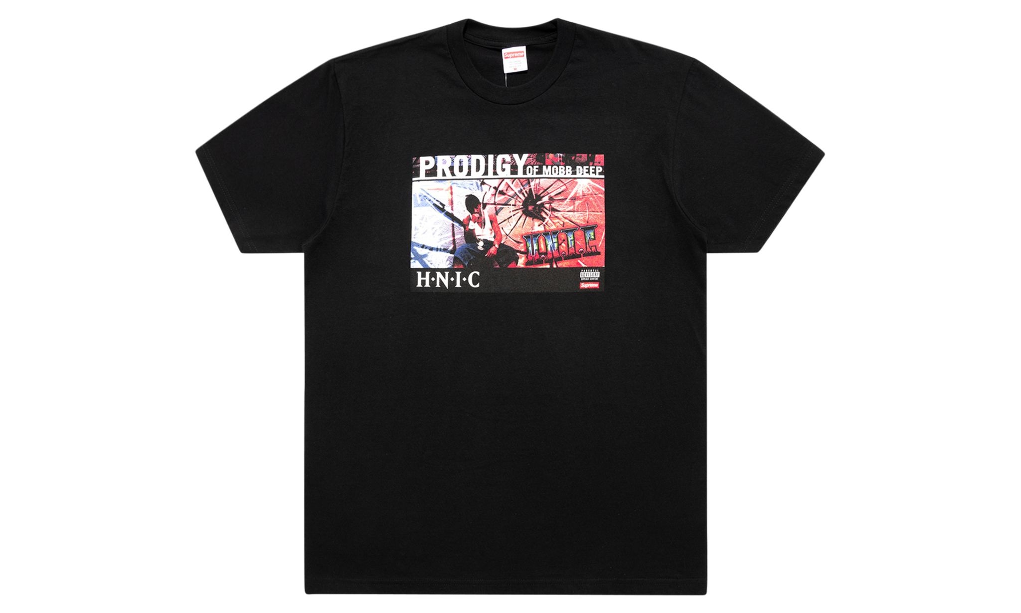 The Supreme H.N.I.C. T-Shirt contains original artwork from the debut solo album by American rapper Prodigy. A piece from the Supreme collection that was released in Spring/Summer 2021, the short sleeve tee in black features the choice album artwork centered on the front chest with a small Supreme box logo in the bottom right corner. After four albums with hip-hop group Mobb Deep, this was Prodigy's first album as a solo artist. Prodigy, who passed away in 2017, was memorialized by Supreme with this tee.