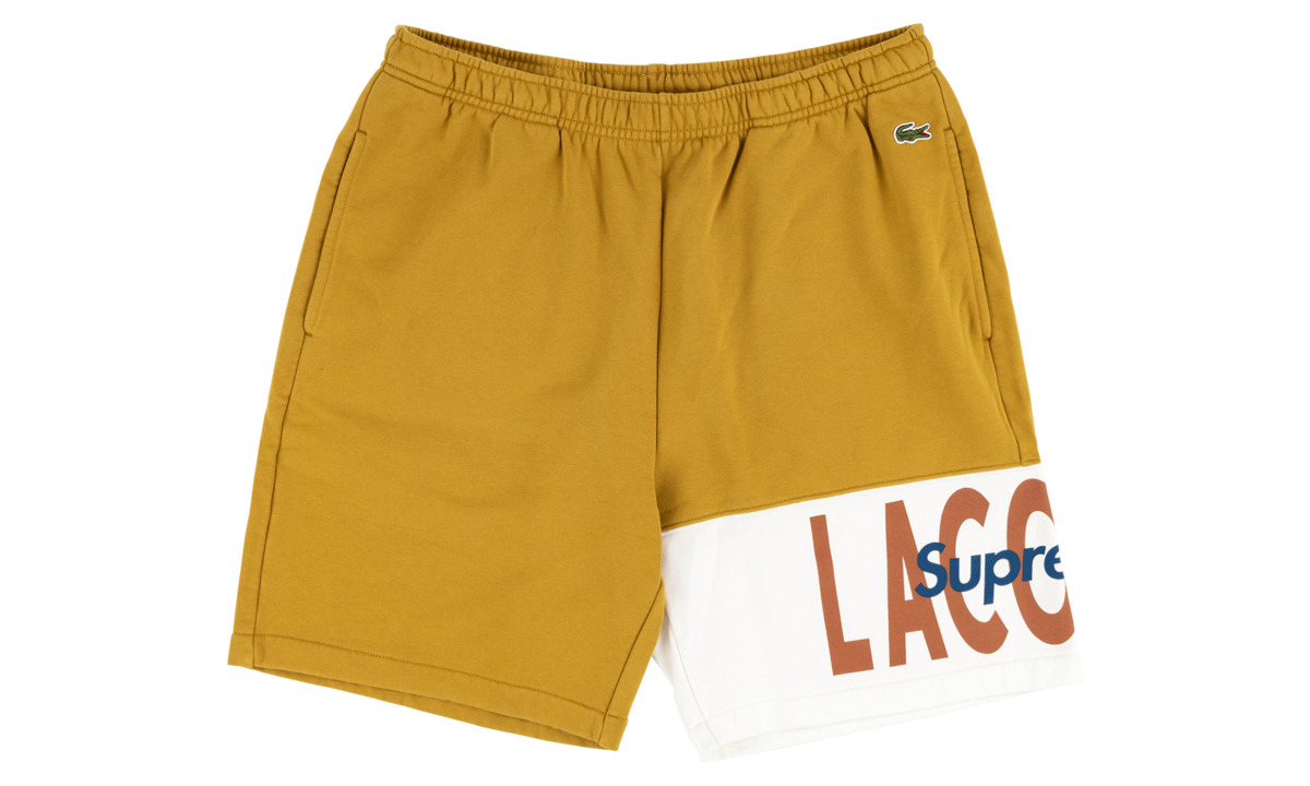 The Lacoste x Supreme Logo Panel Sweatshort is a comfortable pair of shorts ready to wear for any occasion. On the court or on the couch, this pair can be used for performance when you want it — or not. The cotton fleece shorts are a mustard yellow Gold color with an interior drawcord used to adjust the waist with a convenient back pocket. A large white color block is positioned at the bottom of the left leg and Lacoste and Supreme logos in burnt sienna and navy blue are seen layered inside.