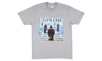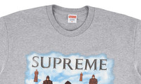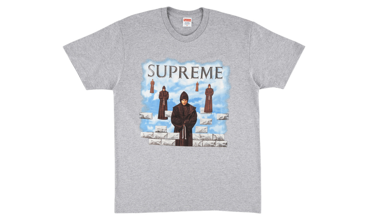 The Supreme Levitation Tee is a heather grey short sleeve graphic T-shirt from Supreme's Fall/Winter 2019 season that was inspired by an album cover for "Chants," which was written by the Benedictine Monks of Santo Domingo de Silos. One of the more obscure references of the season, the front of the tee features several floating monks against a white cloud backdrop. Rounding out the design are mismatched grey bricks that appear on the bottom of the graphic and grey Supreme branding on the top portion of the tee.