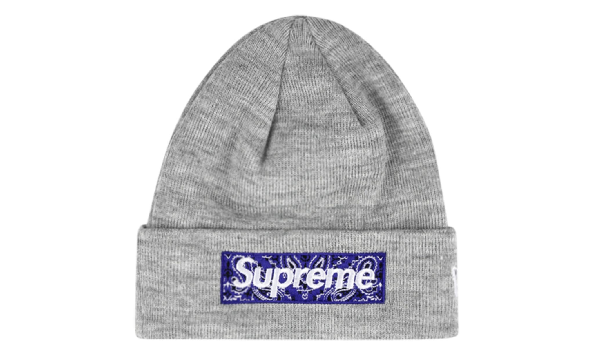 Bandanas can be worn around your your neck. But everyone knows it is cooler on your head, wearing this heather grey wool Supreme x New Era Bandana Box Logo beanie. Choose the better option. Featuring a knitted style, an upturned brim, a front logo patch and embroidered details.