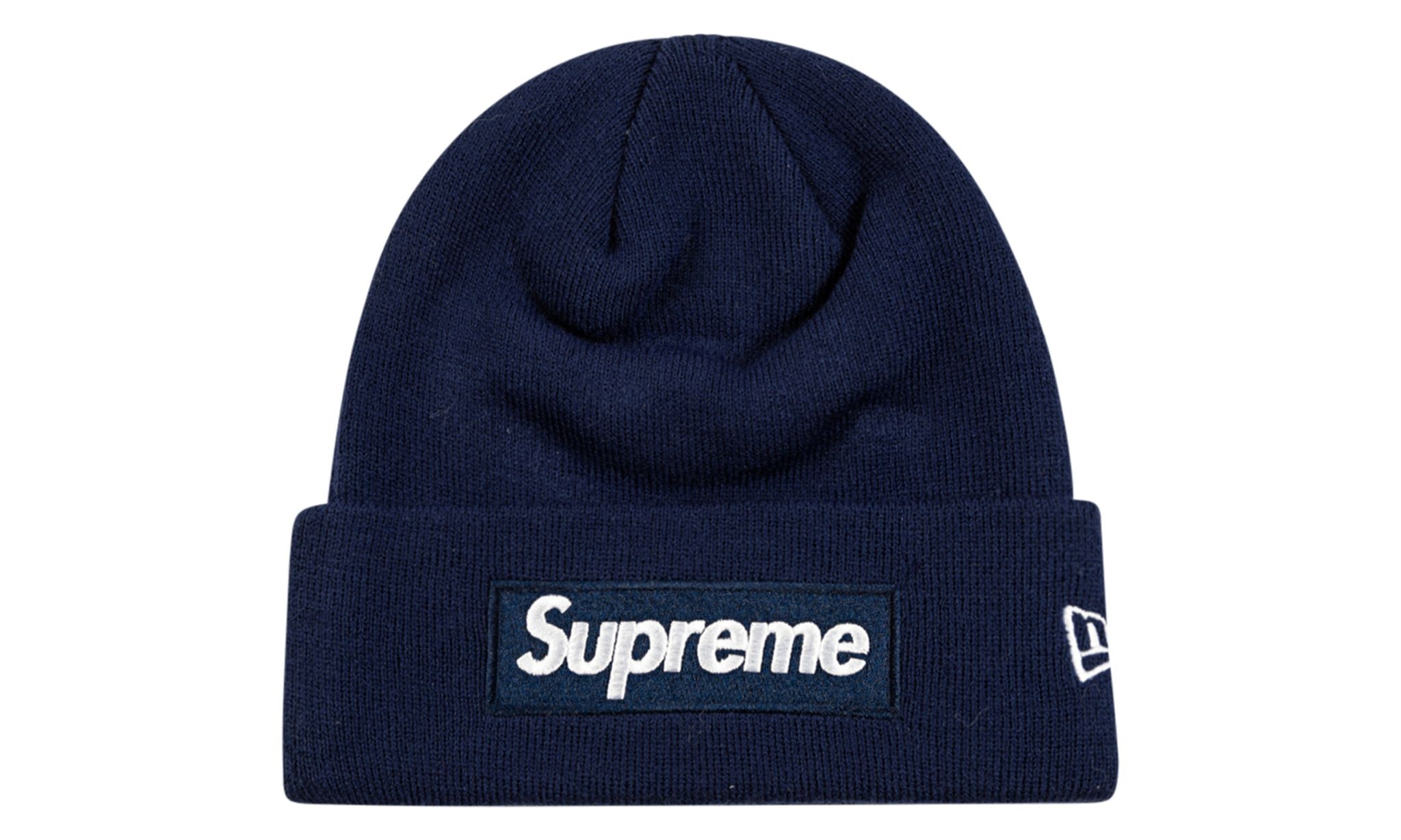 The Supreme New Era Box Logo Beanie “Navy” is a cold weather essential from the New York streetwear brand’s Fall/Winter 2021 collaboration with New Era. One of nine colorways, the Supreme New Era Box Logo Beanie is a navy blue acrylic wool beanie that features an embroidered tonal Supreme Box Logo with white lettering on the front cuff. Additional branding includes a white “New Era” logo on the side and “World Famous” lettering, also in white, on the back. Release date: December 9, 2021