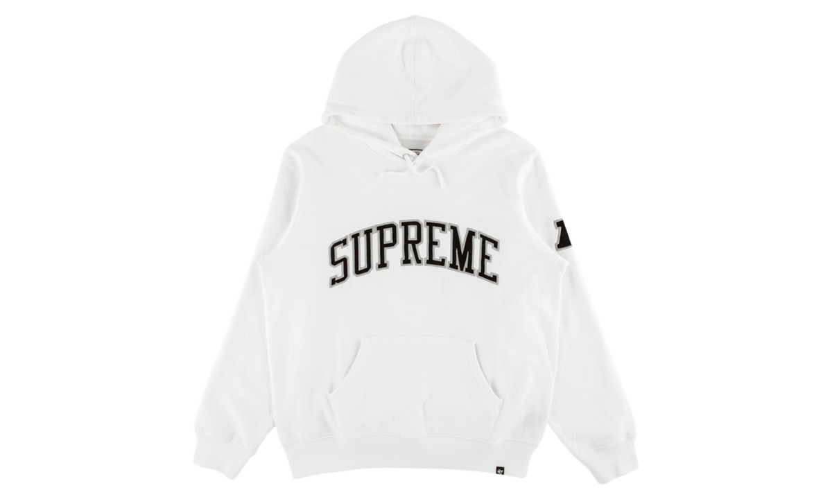 The Supreme Raiders ‘47 Hoodie is part of a collaborative assortment that launched with the Supreme Spring/Summer 2019 collection. On the front of the cotton hooded sweatshirt is a Supreme logo across the chest. A large Raiders logo flanks the back and an AFC logo appears on the left arm. The hoodie is appropriately shaded in white, black, and silver Raiders colors. With an overwhelming number of white hoodies on the market, this particular one should be a no-brainer for Raiders fans and anyone who likes the team's rebel spirit.