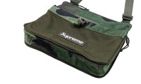 The Supreme Side Bag from the Fall/Winter 2021 collection offers a practical way of holding everything you need for the day, and it looks good, too. Here, a classic green camouflage pattern covers the bag made of water-resistant Cordura® recycled nylon ripstop. Most of the bag is marked with a repeating “SUPREME” jacquard logo print. When you break it down, the Supreme Side Bag has a main zip compartment with velcro front pocket, interior elastic shock cord closure, and adjustable shoulder strap. It may be a simple carryall option, but being from Supreme, it always makes a statement.