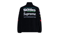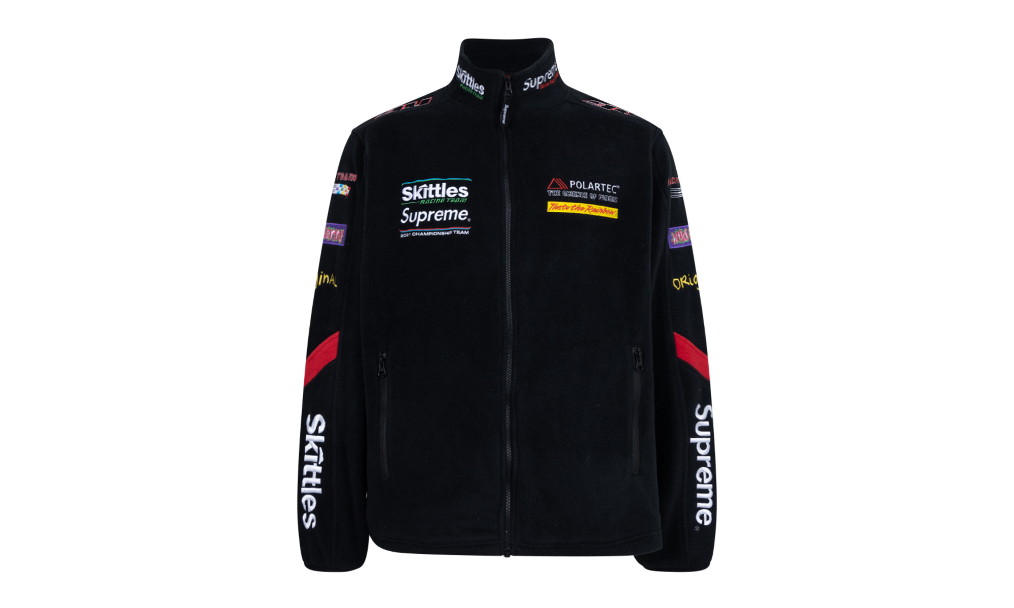 The Skittles x Supreme Polartec Jacket from Supreme's Fall/Winter 2021 collection features an unlikely partnership between the skate brand and multi-colored fruit candy. But as with all Supreme collaborations, it's unexpected, unique, and it really works. Skittles returned to NASCAR in 2021 as a car sponsor after a 10-year hiatus. The black racing jacket is made of Polartec® 200 fleece with all sorts of co-branding displayed on the collar, chest, sleeves and back—including the famous "Taste the Rainbow" tagline.