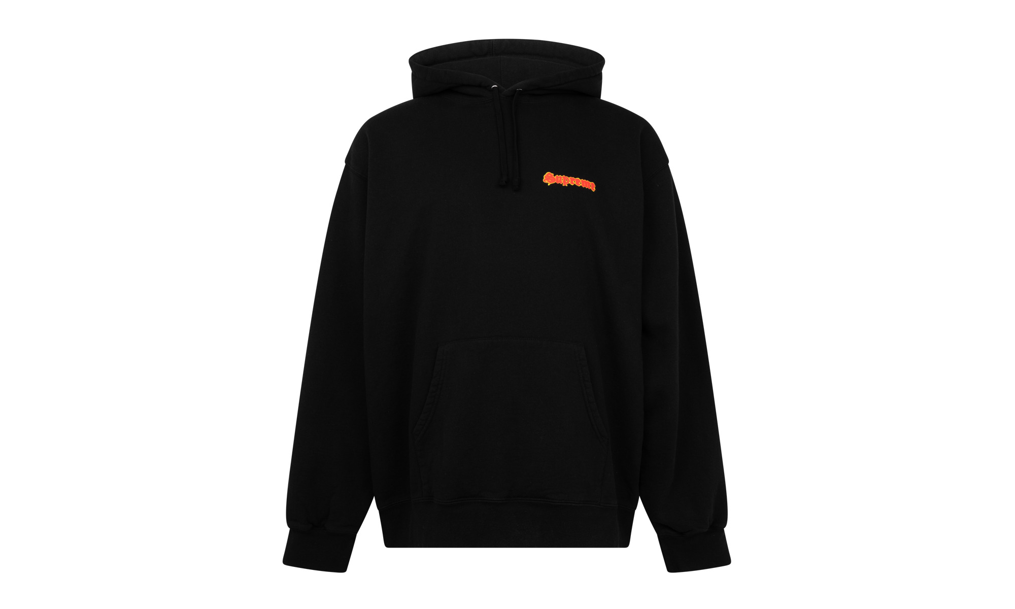 The Supreme Love Hoodie is a black hooded sweatshirt from the Supreme Spring/Summer 2021 collection. Large graphic art on the majority of the back includes a "Te Amo | RIP | Supreme Love" print in bold red and yellow colors. In the middle of it all is a rose situated inside a heart, perhaps symbolizing love in the midst of grief. Roman numerals MMXXI (2021) are seen at the bottom of the design.
