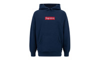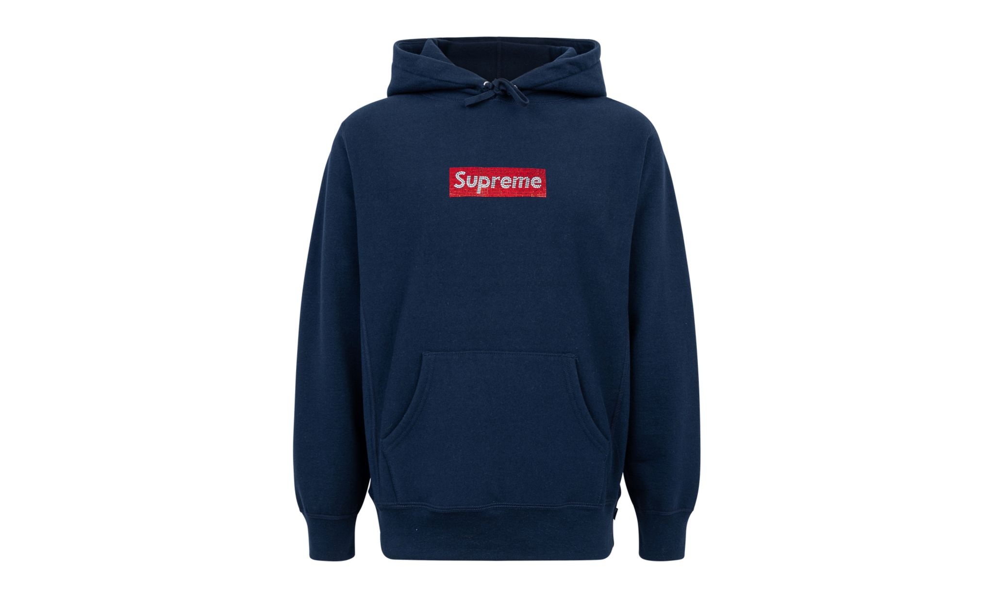 The Supreme Swarovski Box Logo Hoodie in navy blue is one of three colorways for the special edition hoodie featuring the streetwear brand’s iconic logo constructed in crystals. Supreme tapped Swarovski to help them celebrate their 25th anniversary in 2019 with this luxurious take on the box logo. The design features 1,201 red and clear Swarovski crystals that were handcrafted to form the Supreme box logo. The box logo appears on the chest of a navy Supreme fleece hoodie. Released in very limited quantities, all three colorways of the hoodie sold out instantly and are now a coveted collector’s items. <br>
