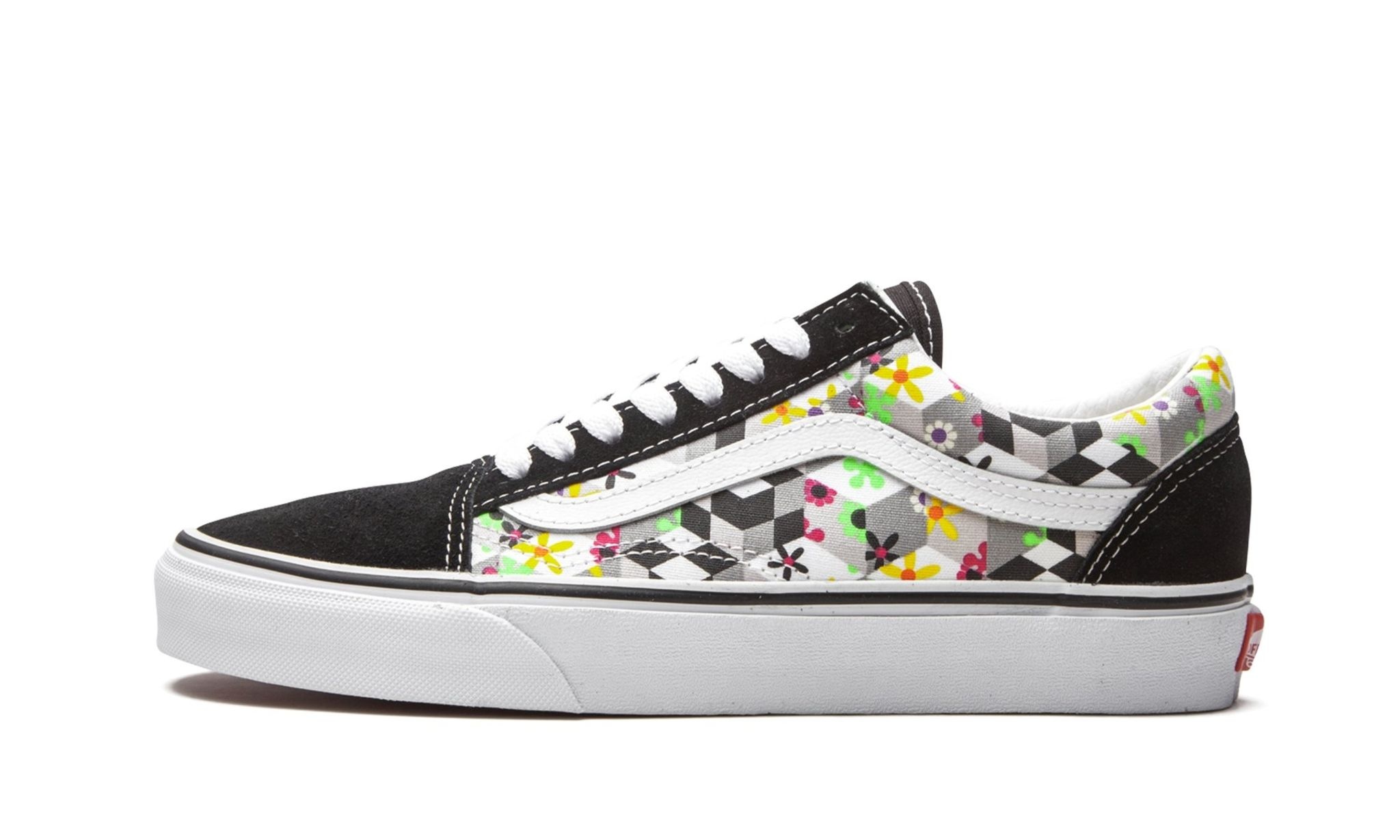 The Vans Old Skool "Checker Cube" offers a fresh take on the classic Vans style. Heavy-duty canvas and suede make up the upper with solid black at the front and back, white shoe laces, and a white leather side stripe. A bold, black-and-white geometric pattern is then seen at the midfoot layered with colorful flowers. The uniquely patterned design rests on a crisp white midsole and waffle rubber outsole, accented with Vans’ signature "Off the Wall" license plate in red.