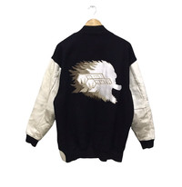 PLEASE ASK ANY QUESTION BEFORE BUYING!!! THIS IS USED CLOTHING!!! PLEASE DONT EXPECTED IT TO BE LIKE NEW OR IN PRISTINE CONDITION MotoMouth Varsity wool jacket sleeve leather Tag : MotoMouth saiz : L(on tag) Mesasures About ( Approxima ) -arm pit : 26inch -lenght : 31inch Condition : good 9/10 Colour : Black/white ** See more detail picture** **no difect** PLEASE READ THE DESCRIPTION AND POLICY BEFORE BUYING ACCEPT PAYMENT: PAYPAL ONLY ALL ITEM WILL BE SHIPPED WITHIN 3-5 BUSINESS DAY AFTER RECEIVING CLEARED PAYMENT WE ARE USING DHL EXPRESS AND DHL ECOMMERCE WITH TRACKING NUMBER. IT WILL TAKE 10-14 WORKING DAYS TO DELIVERED.PLEASE LEAVE YOUR PHONE NUMBER DURING PURCHASE. NO REFUND!!! PHONE NUMBER REQUIRED FOR DHL EXPRESS (VERY IMPORTANT) P29