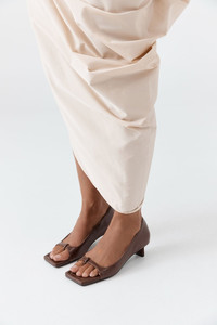The 90s Square Toe Heel is a minimalist silhouette defined by its geometric lines and understated detailing. Designed with a structured square toe and distinctive split-toe opening, it sits on a rectangular kitten heel for subtle elevation. Finished with a softly padded insole, the 90s Square Toe Heel offers comfort while balancing modern edge. DETAILS Materials - Upper: 100% Lambskin Leather - Insole: 100% Bovine Leather - Outsole: 100% Bovine Leather - Leather Working Group (LWG) Certified Garment Details - Rectangular kitten heel, square toe, split toe opening, soft padded insole Manufacturing - SMETA Sedex Ethical Audit - Manufacturer has signed the St. Agni Code of Conduct - R - esponsibly made in China SIZING - Heel height: 4cm CARE - Clean gently with a soft cloth - Apply leather protector of your choice before wear - Avoid prolonged exposure to water - Allow to air dry, away from direct heat - Store in a cool, dry place in the provided, breathable dust bag - Keep out of direct sunlight and humidity - Use shoe forms or gently stuff with tissue, when storing, to maintain shape - Rotate between shoes, allowing them to rest between wears - Aging is expected and embraced - wear reflects the journey - Following proper care and storage advice, honours their form and extends their life
