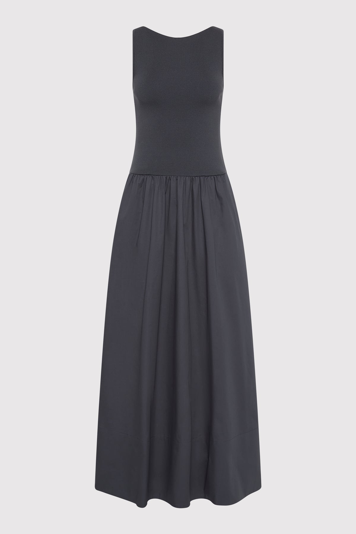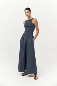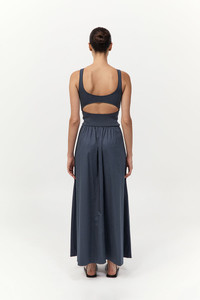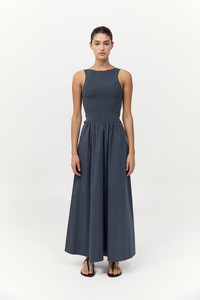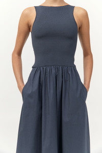 The Bateau Cut Out Dress offers a refined silhouette with subtle cut-out detailing. Featuring a fitted knit bodice that flows into a relaxed poplin skirt and maxi length. A versatile wardrobe essential, the Bateau Cut Out Dress transitions effortlessly from day to evening. DETAILS Materials - Bodice: 53% Viscose / 47% Recycled Polyester - Skirt: 100% BCI Cotton - SMETA Yarn - Recycled Polyester (GRS) Certificate - BCI Cotton Certificate Garment Details - Maxi length, bateau neckline, sleeveless, knitted bodice, front slash pockets, poplin skirt, unlined Manufacturing - SMETA Sedex Ethical Audit - OEKO-TEXT 100 Certification - Manufacturer has signed the St. Agni Code of Conduct - Responsibly made in China CARE - Cool hand wash - Wash with similar colours - Do not bleach - Do not tumble dry - Cool iron under cloth - Dry cleanable (P)