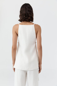 The Belted Side Detail Top is crafted from 100% linen and lined with TENCEL™ Lyocell for breathable comfort and an elevated hand feel. Featuring a square neckline and open side seams with belt tie-fastening, offering soft structure with subtle edge. Pair effortlessly with the Fine Band Carter Trouser for a streamlined ensemble. DETAILS Materials - 100% Linen - Lining: 100% TENCEL™ Lyocell - European Flax LENZING™ TENCEL™ Certificate Garment Details - Square neckline, sleeveless, thin straps, bust darts, open side seams with belt tie-fastening, lined - Relaxed fit Manufacturing - SMETA Sedex Ethical Audit - Manufacturer has signed the St. Agni Code of Conduct - Responsibly made in China CARE - Dry clean only - Do not bleach - Do not tumble dry - Warm iron with cloth