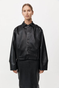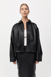 The Cocoon Leather Jacket features a relaxed fit with a collared neck and cocoon shaping. It includes front, back, and sleeve darts for a tailored look and is finished with concealed magnetic buttons for a sleek appearance. Crafted from 100% lamb leather and lined with 100% TENCEL™ Lyocell. DETAILS Materials - 100% Lamb Leather - TENCEL™ Lyocell lining - Vegetable Dyed Leather - Leather Working Group (LWG) Certified Garment Details - Collared neck, cocoon shaping, front, back and sleeve darts, concealed magnetic buttons, relaxed fit Manufacturing - Manufacturer has signed the St. Agni Code of Conduct - SGS Social Accountability - 8000 Audit Certification - Responsibly made in India CARE - Dry clean only - Spot clean with damp cloth