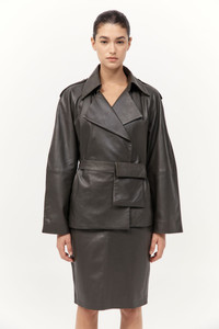 A refined silhouette that balances precision tailoring with everyday functionality, the Cropped Leather Trench has been crafted from 100% lambskin leather and lined in 100% TENCEL™ Lyocell. The Cropped Leather Trench features a double-breasted front, structured epaulettes and raglan sleeves with panel detailing. Completed with a belted waist with an integrated pocket. DETAILS Materials - 100% Lambskin Leather - Lining: 100% TENCEL™ Lyocell - Leather Working Group (LWG) Certified Garment Details - Cropped length, double breasted, epaulettes, front press studs, raglan sleeves with panel detail, belted waist with pocket, belt loops, back storm flap, lined Manufacturing - SGS Social Accountability - 8000 Audit Certification - Manufacturer has signed the St. Agni Code of Conduct - Responsibly made in India CARE Natural Leather Protector is recommended before wear. Use a good quality leather conditioner or protective spray to treat the product to increase its durability. Regularly clean leather with a soft brush or cloth, regularly air out leather, and where possible do not get leather wet. Blot away water or moisture as soon as possible, do not immerse leather in water to clean, do not dry wet leather with artificial heat like a radiator or hairdryer, do not machine wash leather, do not tumble dry leather, do not iron leather. Keep out of direct sunlight to avoid fading and avoid wet weather. Marks and variations in the leather are not considered a fault but are inherent to the natural beauty and uniqueness of the leather. When not in use we advise to store your St. Agni product in its protective bag and we recommend to continually treat it with a leather conditioner to keep it hydrated for a long life.