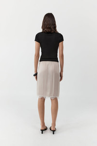 Made from fluid silk, the Fine Lace Skirt sits low on the waist and falls to the knee, finished with a fine lace trim that adds a discreet textural note. Versatile in design, the Fine Lace Skirt transitions with ease from day to evening. DETAILS Materials - Skirt: 100% Silk - Trim: 100% Nylon Garment Details - Low rise, knee length, elasticated waistband with self tie, lace trim detail, unlined - Slim fit Manufacturing - SMETA Sedex Ethical Audit - OEKO-TEX Standard 100 Certification - Manufacturer has signed the St. Agni Code of Conduct - Responsibly made in China CARE - Dry clean (P) - Do not bleach - Do not soak - Do not tumble dry - Iron on low heat under cloth