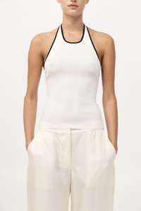 Featuring a halter neckline and low scooped back, the Fine Line Halter Top is defined by clean lines and a minimalist silhouette. Contrast piping adds a refined, modern touch. Wear it alone or layered over the Fine Line Long Sleeve Top for versatile styling. DETAILS Materials - 82% TENCEL™ Lyocell - 16% Nylon - 2% Elastane - LENZING™ Certificate Garment Details - Halter neckline, sleeveless, low scooped back, contrast piping detail, hip length Manufacturing - SMETA Sedex Ethical Audit - Manufacturer has signed the St. Agni Code of Conduct - Responsibly made in China CARE - Wash and dry garment turned inside out - Cold hand wash separately in mild detergent - Do not soak - Do not bleach - Do not twist or wring - Do not tumble dry - Dry flat in shade - Ease into shape - Cool iron on reverse side - Do not hang - Store flat - Do not dry clean (X)