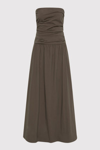 The Gathered Strapless Tie Back Dress falls to a maxi-length silhouette with an A-line skirt, offering a refined, yet effortless look. Side boning at the torso provides structure, while delicate gathering details add a soft touch. The back is complemented by a striking tie detail. The Gathered Strapless Tie Back Dress is destined for high rotation wear. DETAILS Materials - 66% Cotton - 31% Recycled Nylon - 3% Spandex Garment Details - Maxi length, strapless tie back, gathered bodice, side seam pockets, boning, center-back invisible zip, full circle skirt, unlined Manufacturing - SGS Social Audit - Manufacturer has signed the St. Agni Code of Conduct - Responsibly made in China CARE - Cool hand wash - Wash with similar colours - Do not bleach - Do not tumble dry - Cool iron under cloth - Dry cleaning recommended