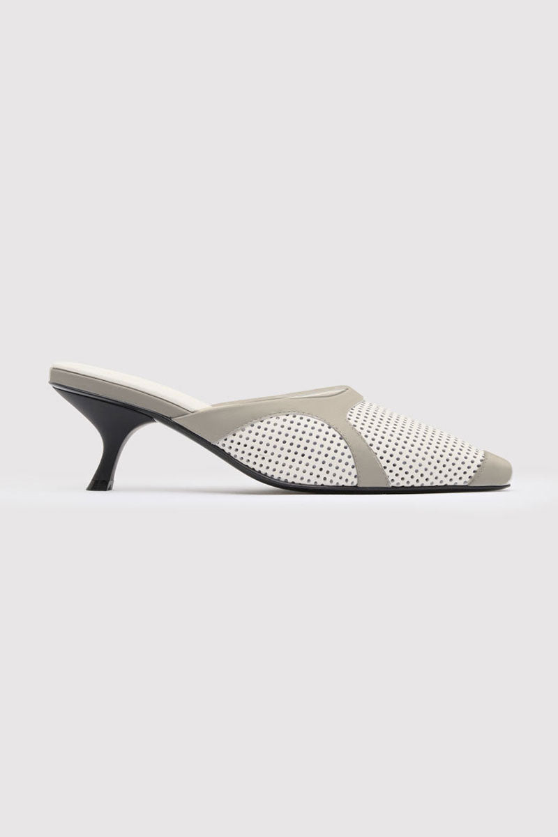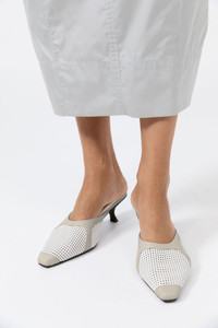 The Perforated Heel is textural and architectural in design. With a squared pointed toe and subtle kitten heel, its perforated leather upper is complemented by contrast leather detailing. Finished with a soft padded insole, the Perforated Heel is a versatile style with distinctive appeal. DETAILS Materials - Upper: 100% Calfskin Leather - Lining: 100% Lambskin Leather - Insole: 100% Calfskin Leather - Outsole: 100% Bovine Leather - Leather Working Group (LWG) Certified Garment Details - Kitten heel, squared pointed toe, perforated body with contrast leather design, soft padded insole, curved heel Manufacturing - BSCI Social Audit - Manufacturer has signed the St. Agni Code of Conduct - Responsibly made in China SIZING - Heel height: 6cm - Height (including insole): 7cm CARE Natural Leather Protector is recommended before wear. Keep out of direct sunlight to avoid fading and avoid wet weather. Marks and variations in the leather are not considered a fault but are inherent to the natural beauty and uniqueness of the leather. When not in use we advise to store your St. Agni product in its protective bag and to occasionally treat it with a leather conditioner to keep it hydrated.