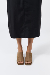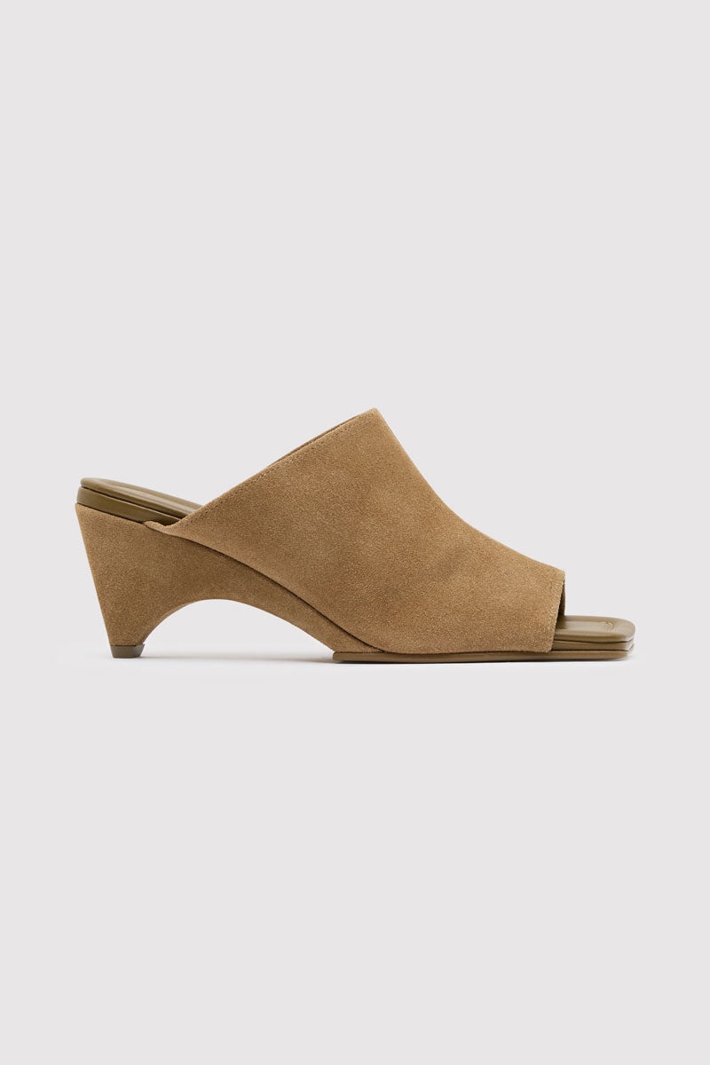 The Suede Arc Wedge offers a soft interpretation of structured dressing. Designed with a wide suede strap with a stitch detail, the Suede Arc Wedge is set on a sculptural arc-shaped heel with an open toe. A tactile and directional silhouette for elevated everyday wear. DETAILS Materials - Upper: 100% Calfskin Suede Leather - Insole: 100% Calfskin Leather - Outsole: 100% Bovine Leather - Wedge: 100% Calfskin Suede Leather - Leather Working Group (LWG) Certified Details - Arc detail wedge, wide upper with stitch detail, soft padded insole, ballet split outsole Manufacturing - BSCI Social Audit - Manufacturer has signed the St. Agni Code of Conduct - Responsibly made in China SIZING - Heel height: 7cm - Height (including insole): 8cm CARE Natural Leather Protector is recommended before wear. Use a good quality leather conditioner or protective spray to treat the product to increase its durability. Regularly clean leather with a soft brush or cloth, regularly air out leather, and where possible do not get leather wet. Blot away water or moisture as soon as possible, do not immerse leather in water to clean, do not dry wet leather with artificial heat like a radiator or hairdryer, do not machine wash leather, do not tumble dry leather, do not iron leather. Keep out of direct sunlight to avoid fading and avoid wet weather. Marks and variations in the leather are not considered a fault but are inherent to the natural beauty and uniqueness of the leather. When not in use we advise to store your St. Agni product in its protective bag and we recommend to continually treat it with a leather conditioner to keep it hydrated for a long life.