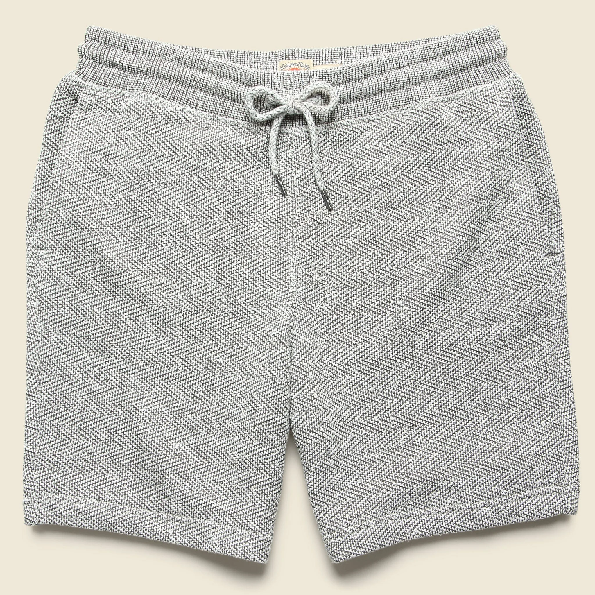 Ideal for beach days or a lazy Sunday at home, these Whitewater Sweatshorts from Faherty are made from a cozy cotton-poly bend that’s been brushed for extra softness. Jacquard-knit with a subtle herringbone pattern and finished with a comfortable drawstring waist, two hand pockets, and a buttoned back pocket to keep essentials safe and secure when you’re out and about. - Soft cotton-poly blend - Jacquard-knit herringbone pattern - Buttoned back pocket - Side seam pockets - Elastic waist with drawstring - Slim fit that runs true to size - We recommend taking your normal size or tanking one size up for a more relaxed fit Materials: 74% cotton, 26% polyester The following measurements are for size Medium: Waist: 30-32" | Rise: 12” | Inseam: 8” | Thigh: 11" | Leg Opening: 20”