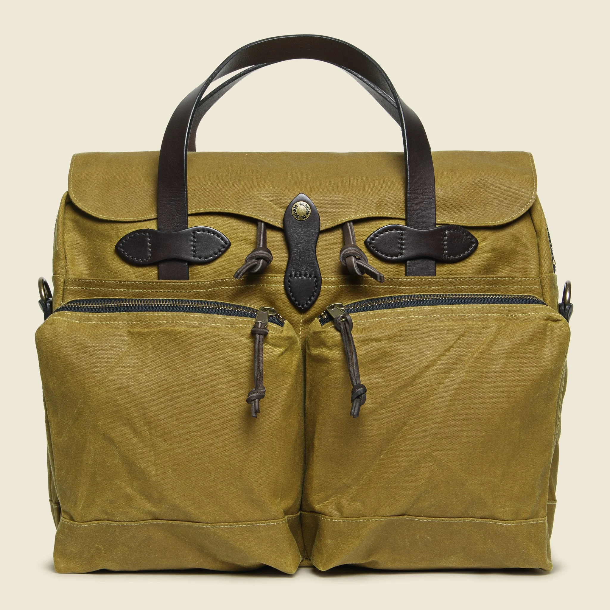 The 24 Hour Tin Cloth Briefcase is made with Filson's toughest waxed canvas. Able to withstand rain, snow, punctures, and tears, this briefcase is meant to travel and meant to last a lifetime. Sporting a deep tan color, and fully lined with cover cloth, the 24 Hour Briefcase is sure to stay sharp for years to come. - Weather-repellant heavyweight waxed canvas - Storm-flap top with snap closure - Interior dividers and pockets - Holds up to a 15" standard laptop - Adjustable cotton shoulder strap - Bridle leather handles and body tab details Materials: 100% waxed cotton canvas Dimensions: 16" W x 12" H x 5.5" D