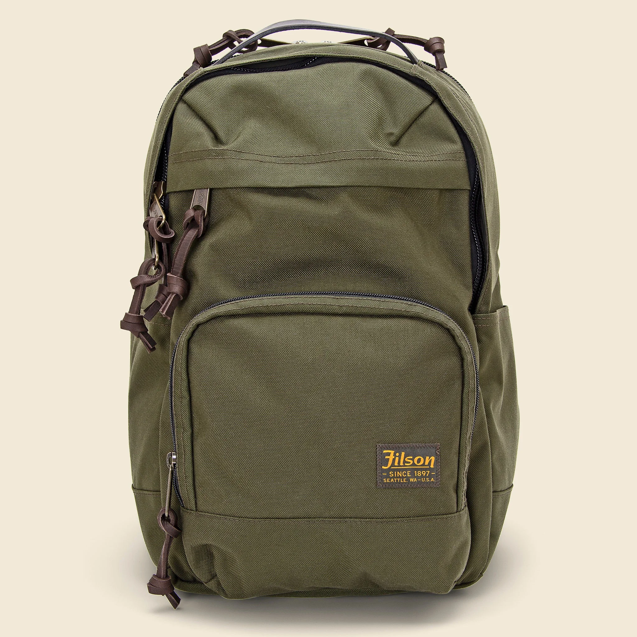 The Filson Dryden Backpack is constructed from 1000-D Cordura nylon, built to withstand the wear and tear of travel and everyday use. Featuring a double-layered reinforced bottom for added durability and a hidden zipper rear padded laptop sleeve to securely and safely stow your tablet or laptop up to 16”. Finished with Bridle Leather and nylon webbing for multiple convenient carrying options and heavy-duty coil zippers to help prevent snagging. - Heavy-duty Cordura nylon fabric is durable and water-resistant - Double-layer reinforced bottom - Coil-zippers to help prevent snagging - Panel-opening zipper for easy access - Zippered mesh pocket inside main compartment - Front zippered full-width pocket - Side-stow pockets - Padded-laptop pocket - Bridle leather grab handle - Leather tabs on shoulder straps - Rear trolley straps fit over rolling luggage handles - Meets major airline carry-on size requirements Materials: 100% nylon | 100% leather Dimensions: Height: 18” | Width: 12 ¾” | Depth: 7”