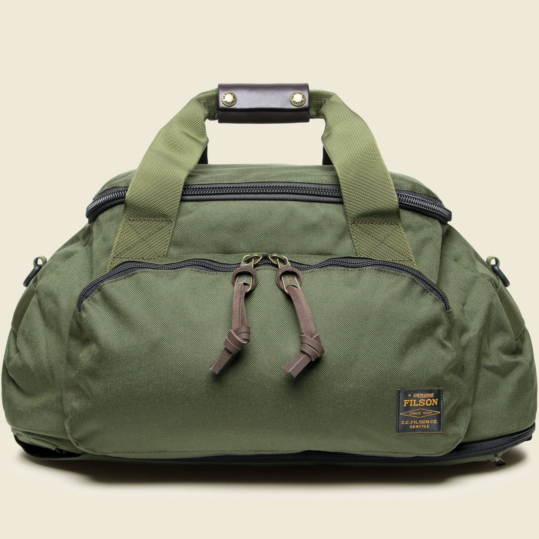The Dryden Duffle Pack from Filson is crafted from hardwearing yet lightweight 1000-denier Cordura nylon fabric that’s woven with the same quality and dependability as ballistic nylon developed for World War II airmen. It’s got plenty of storage space for long weekend getaways and specialized pockets for your computer, necessities such as keys, passports, and wallets, and a second exterior pocket that expands to the main compartment to stow your dirty gear when you’re a long ways off from the nearest laundromat. - Durable 1000-denier Cordura nylon - Exterior zipped gear pocket - External pocket that expands into the interior - Webbing handles & padded backpack straps - Padded back panel with laptop storage (up to 16”) - Detachable backpack & shoulder straps for multiple carrying options - Bridle leather carry grip & zipper pulls - Nylon webbing and interior fabric Materials: 8.7-oz. 1000D Cordura nylon, nylon lining & webbing Dimensions: Length: 23 ½” | Width: 12 ½” | Height: 10”