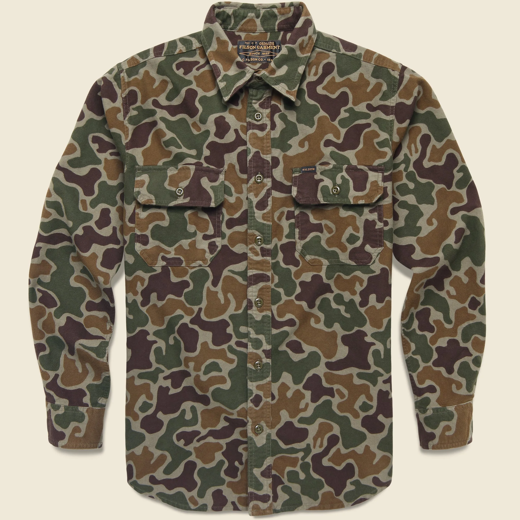 This Field Flannel Workshirt from Filson is cut from a warm mid-weight cotton twill that’s been printed with a classic woodland camo pattern for a vintage-inspired look. It’s finished with a military-grade melamine button front closure, adjustable cuffs, a pair of button-flap chest pockets, and a pleated back to give you a full range of movement in the shoulders. - 7oz, 100% cotton flannel - Printed camouflage pattern - Military-grade melamine buttons - Two button-flap chest pockets - Double-needle construction and flat-felled seams add durability - Relaxed fit through the chest and shoulders - We recommend taking your normal size The following measurements are for size Medium: Chest: 44” | Shoulder: 18” | Sleeve: 33” | Length: 30”