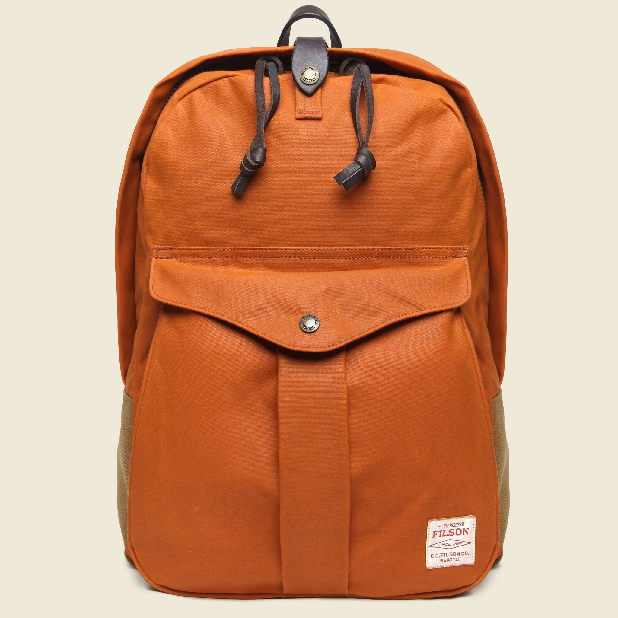 The Filson Journeyman Backpack is made of abrasion and water-resistant twill for years of reliable travel. Outfitted with a padded pack & moleskin-line shoulder straps. Rustproof brass zipper and storm flap closure offers added protection from the weather. - Solid brass zipper closure custom cut at Filson with tab-closure storm flap for added security - One bellow pocket, interior utility pocket, interior zipper pocket & interior padded laptop sleeve - Contoured, padded shoulder straps with cotton webbing strap adjustment - Interior padded sleeve sized to fit a laptop or tablet up to 16" wide - Padded back for comfortable carrying - Matte nylon lining on the bottom and back for reinforcement - Fully lined to protect equipment - Includes iconic Filson Bridle Leather body tabs Materials: 15-oz. oil finish Tin Cloth | poly/cotton lining | Bridle Leather body tabs Dimensions: Width: 12.5" | Height: 17.5" | Depth: 5"