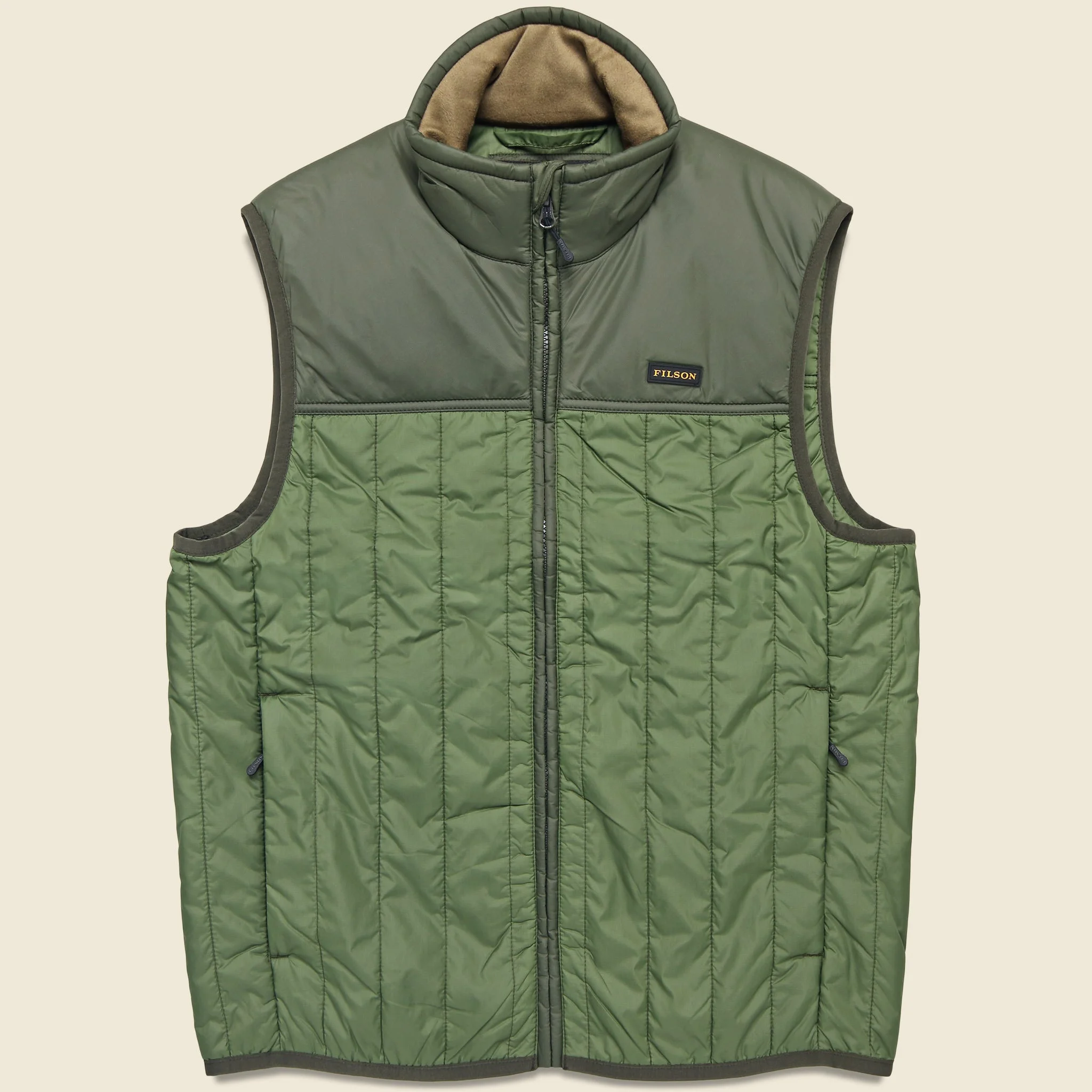 The Ultralight Vest from Filson is made from durable, 1.5oz Cordura nylon that’s channel-quilted with highly compressible, 60g PrimaLoft Gold insulation to provide incredible warmth without all the bulk. It has a perfectly relaxed fit for easy layering and comes with a pair of handwarmer pockets, a reinforced yoke for added durability, and a moleskin-lined collar for extra comfort. - Durable 1.5oz Cordura nylon ripstop - Channel-quilted construction - Lightweight 60g PrimaLoft Gold insulation - Moleskin cotton lining at the collar - Two handwarmer pockets - Elasticated armholes and hem - Zip-front closure with zipper garage - Two zipped handwarmer pockets - Relaxed fit that runs true to size - We recommend taking your normal size Materials: Shell & Lining: 100% nylon | Fill: 100% polyester The following measurements are for size Medium: Chest: 45” | Shoulder: 18” | Length: 27”