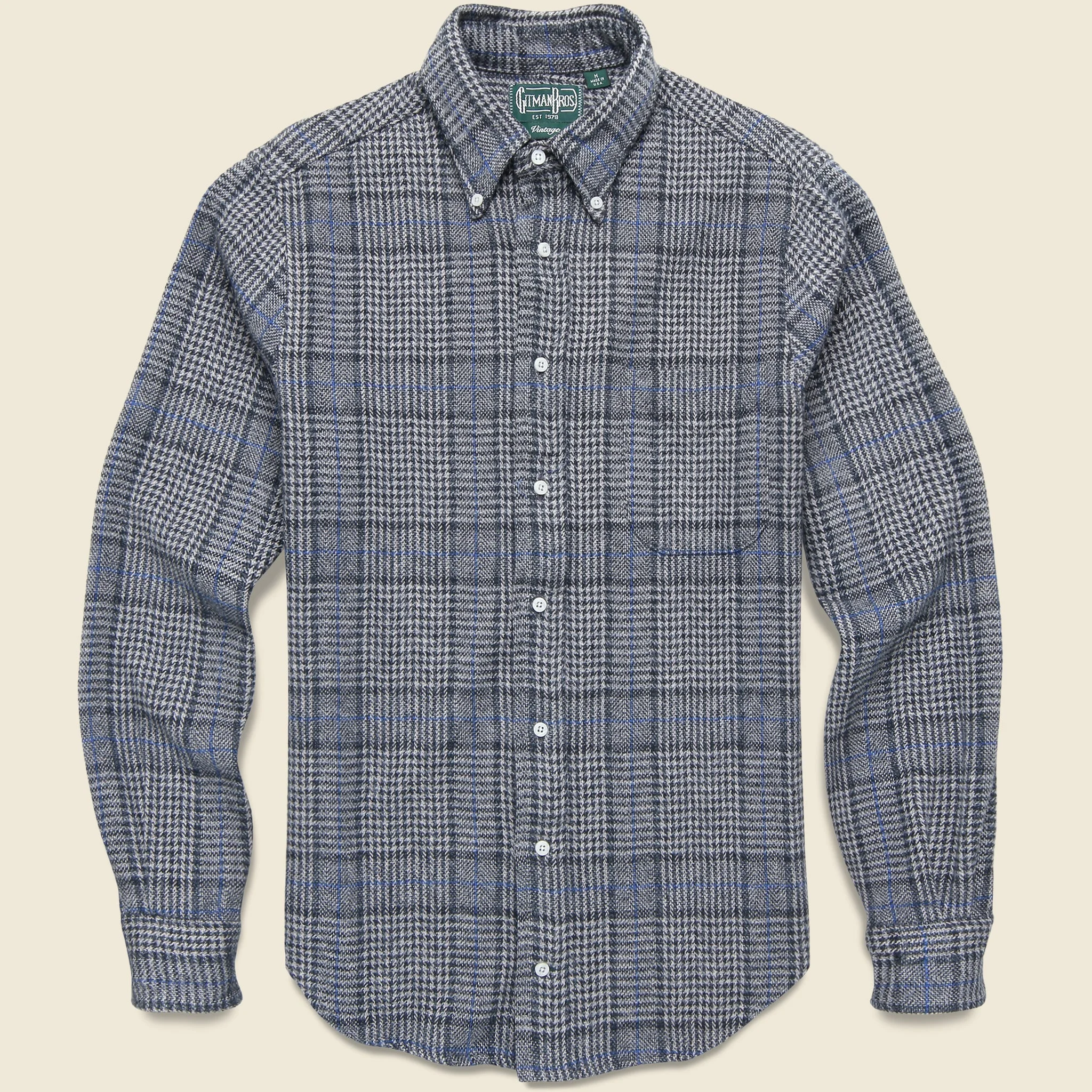 This Cotton Tweed Flannel from Gitman Vintage is made with midweight cotton flannel fabric that’s woven with a seasonal windowpane plaid pattern that’s perfect for the cooler days of the year. It’s tailored with a traditional-slim fit through the chest and comes detailed with a single chest pocket, a chalk button placket, and a classic Oxford collar to top it off. - Midweight cotton flannel - Woven plaid pattern - Single chest pocket - Chalk button placket - Oxford collar - Traditional-slim fit through the chest and shoulder - We recommend taking your normal size or taking one size up for a more relaxed fit Made in USA Materials: 100% cotton The following measurements are for size Medium: Chest: 40” | Shoulder: 16” | Sleeve: 32” | Length: 29”