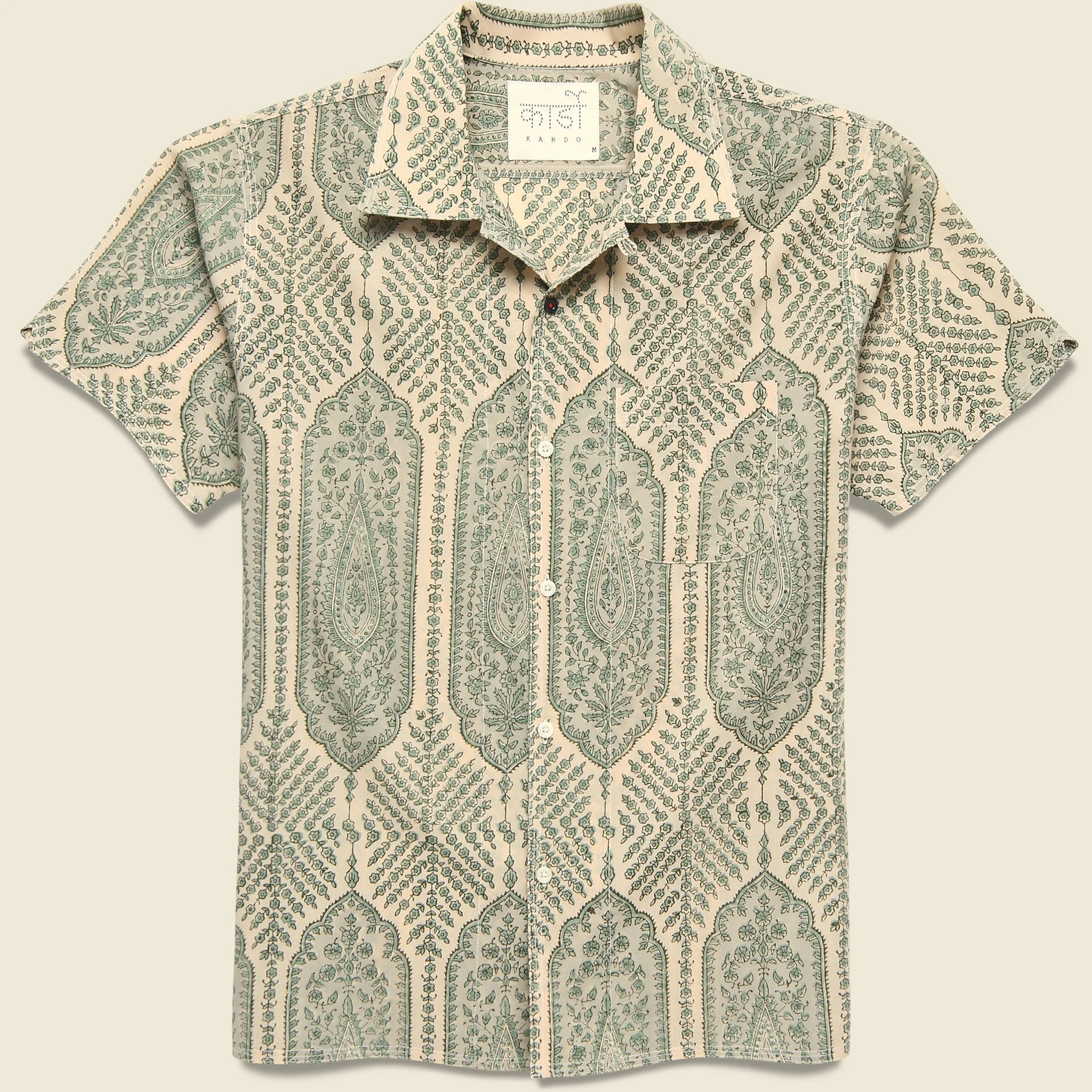 The pattern on this Chintan Shirt from Kardo was developed by carefully hand-stamping a tonal paisley pattern onto the fabric using multiple wooden blocks. Made by a single tailor from beginning to end, it’s got a relaxed fit to keep you cool on hot days and was hand-finished for an unbeatable quality that only gets better with time and wear. - Lightweight cotton - Made by one tailor from beginning to end - Paisley pattern block-printed by hand - Camp collar - Straight hem - Hand-finished - Relaxed fit that runs true to size - We recommend taking your normal size Materials: 100% cotton The following measurements are for size Medium: Chest: 45 ½” | Shoulder: 18” | Sleeve: 17 ½” |Length: 28”