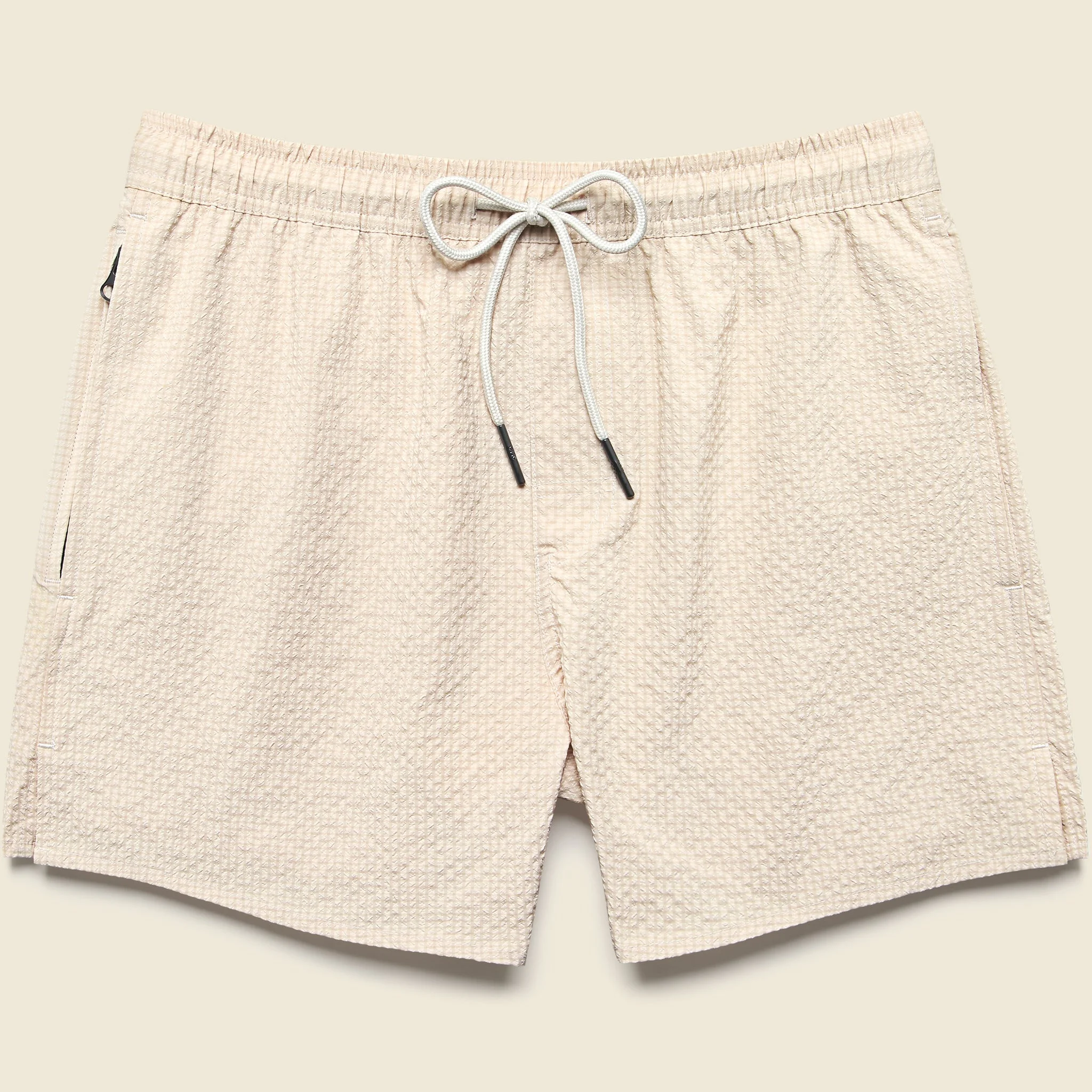These Swim Trunks from OAS are made from a quick-drying, lightweight polyester to give you resort-level comfort whether you’re hanging ten or taking a dip to beat the heat. They’ve got two front pockets, a back pocket, and a hidden zipper pocket for a hotel room key or your bank card on the beach. Finished with a fit that’s not too tight and not too baggy, a comfortable mesh lining, and woven with a striped seersucker pattern, these trunks are an easy go-to for a fun summer. - Quick-drying, lightweight polyester - Woven checkerboard seersucker pattern - Elastic waistband with adjustable drawstring - Dual side-slit hand pockets - Back drop-in pocket - Hidden zippered pocket - 4" inseam hits at upper thigh - Traditional fit that runs true to size - We recommend taking your normal size Materials: 100% polyester The following measurements are for size Medium: Waist: 30-32” | Inseam: 4” | Thigh: 12” | Leg opening: 24” | Rise: 12”