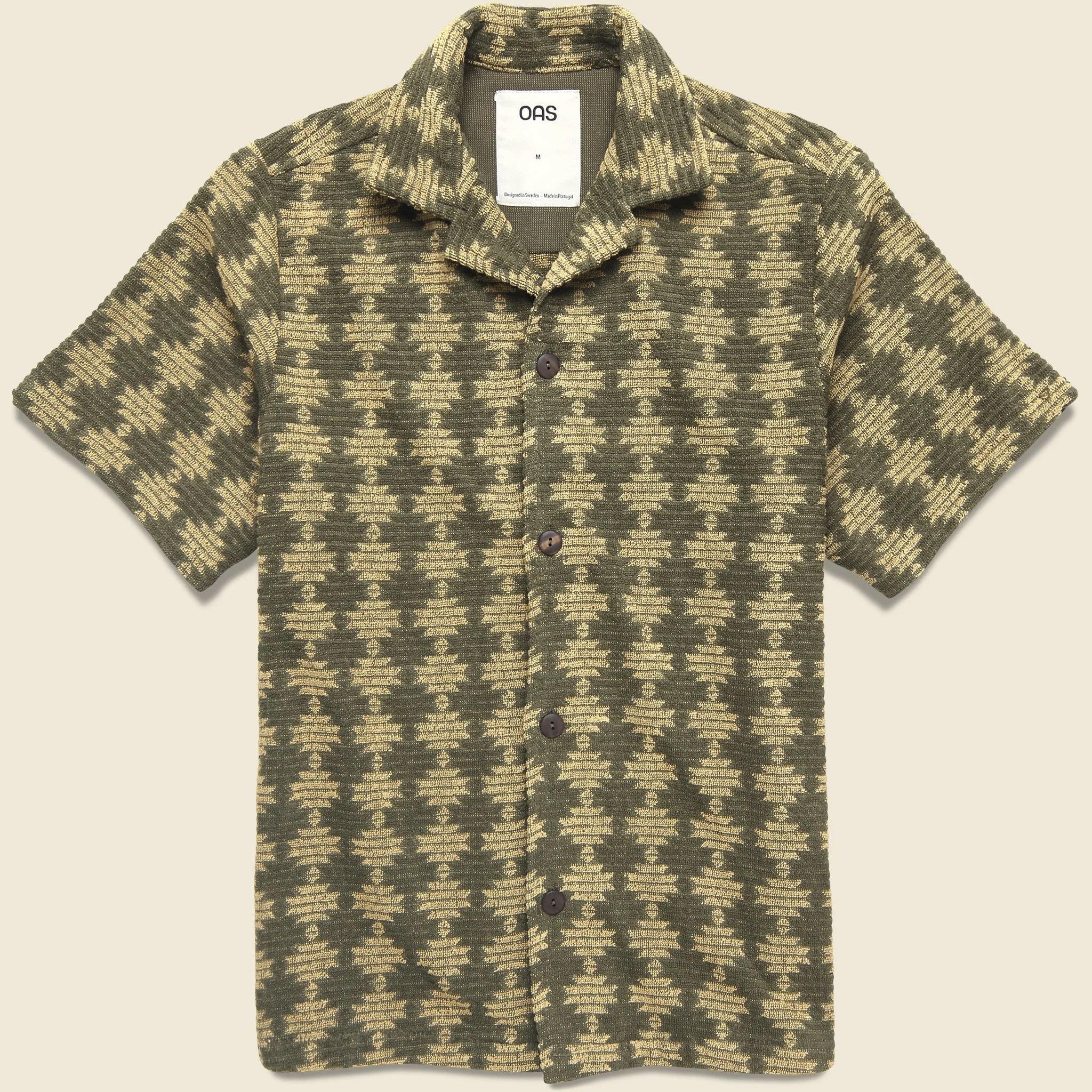 This Forti Terry Shirt from OAS is made with a soft, heavyweight cotton terrycloth that’s woven with a two-toned, textured jacquard pattern inspired by classic mosaic motifs. It’s tailored with a traditional fit that runs true to size and comes with a simple, four-button placket, an open camp collar, and a slightly curved hem to round things out. - Soft, heavyweight cotton - Two-tone, textured jacquard pattern - Simple 4-button placket - Open camp collar - Slightly curved hem - Traditional fit that runs true to size - We recommend taking your normal size Made in Portugal Materials: 100% cotton The following measurements are for size Medium: Chest: 44” | Shoulder: 16 ½” | Sleeve: 18 ½” | Length: 29”