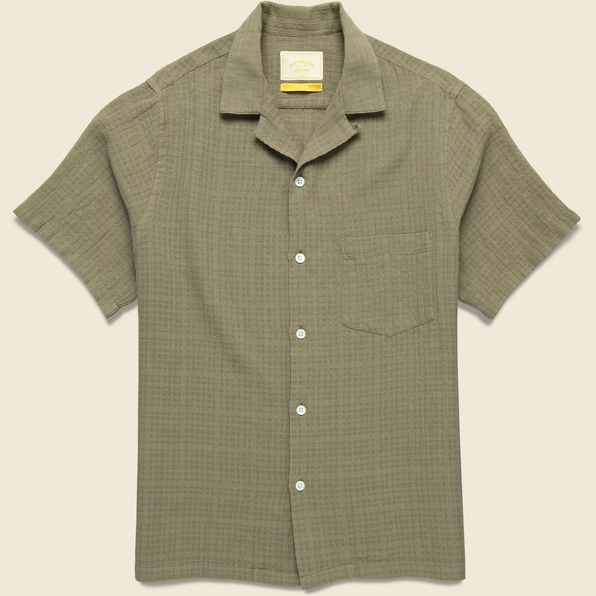 The Grain Cotton Shirt from Portuguese Flannel is made with lightweight cotton that features an airy, textured knit for maximum breathability on hot, sweltering summer days. It has a loose, relaxed fit that runs true to size and comes with a single chest pocket, a simple 5-button placket, and a classic camp collar for an easygoing finish. - Lightweight cotton - Breathable texture - Single chest pocket - Simple 5-button packet - Camp collar - Squared hem - Relaxed fit that runs true to size - We recommend taking your normal size Made in Portugal Materials: 100% cotton The following measurements are for size Medium: Chest: 46 ½” | Shoulder: 18 ½” | Sleeve: 19” | Length: 29 ½”