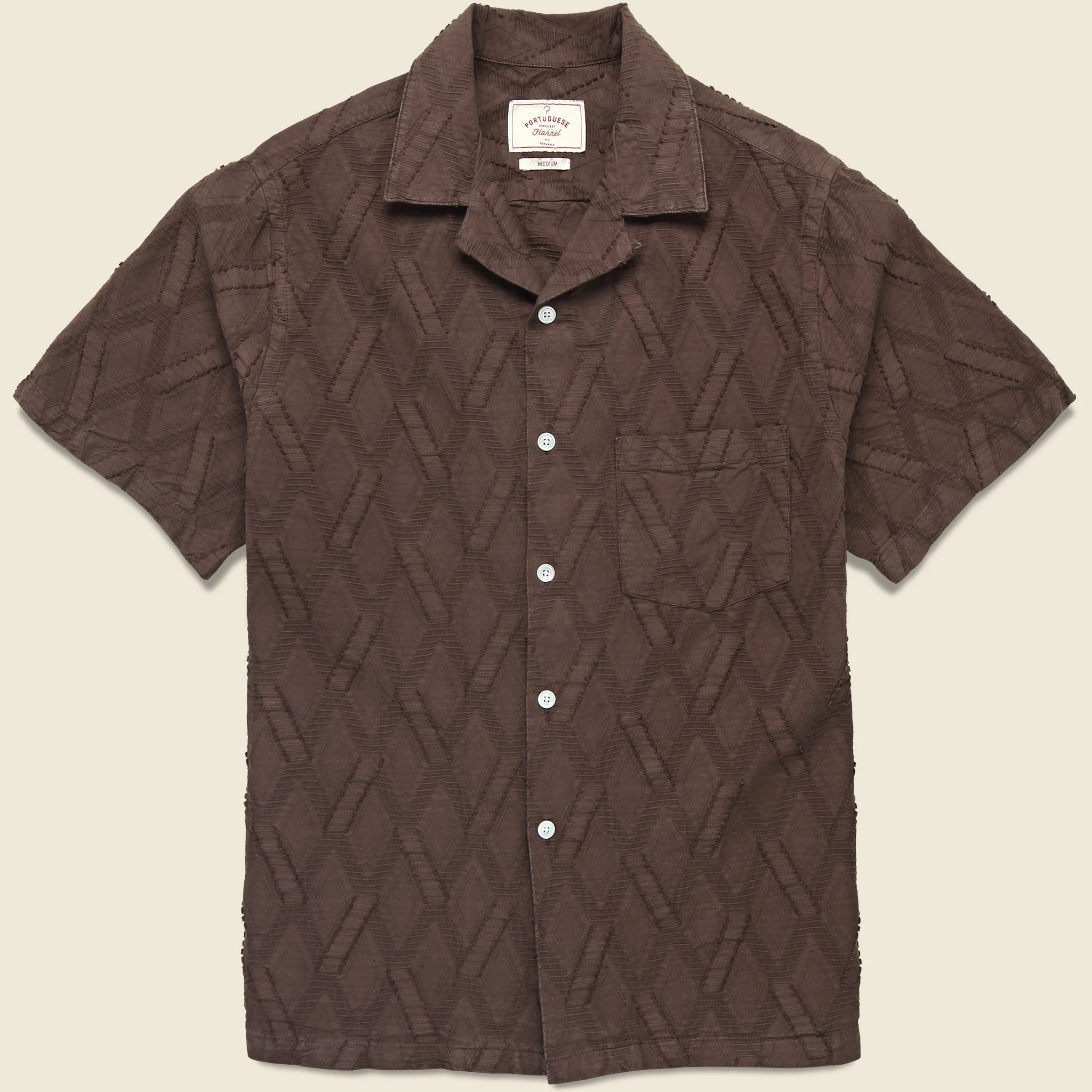 The Ike Camp Shirt from Portuguese Flannel is cut from lightweight cotton that’s woven with a unique, textured geometric pattern. It has a traditional, easygoing fit that’s perfect for warm, sunny summer days and comes with a single chest pocket, a simple 5-button placket, and a classic camp collar for a laid-back 50s feel. - Lightweight cotton - Woven, textured geometric pattern - Single chest pocket - Simple 5-button placket - Camp collar - Squared hem - Traditional fit that runs true to size - We recommend taking your normal size or taking one size up for a more relaxed fit Made in Portugal Materials: 100% cotton The following measurements are for size Medium: Chest: 42” | Shoulder: 16 ½” | Sleeve: 18” | Length: 28 ½”