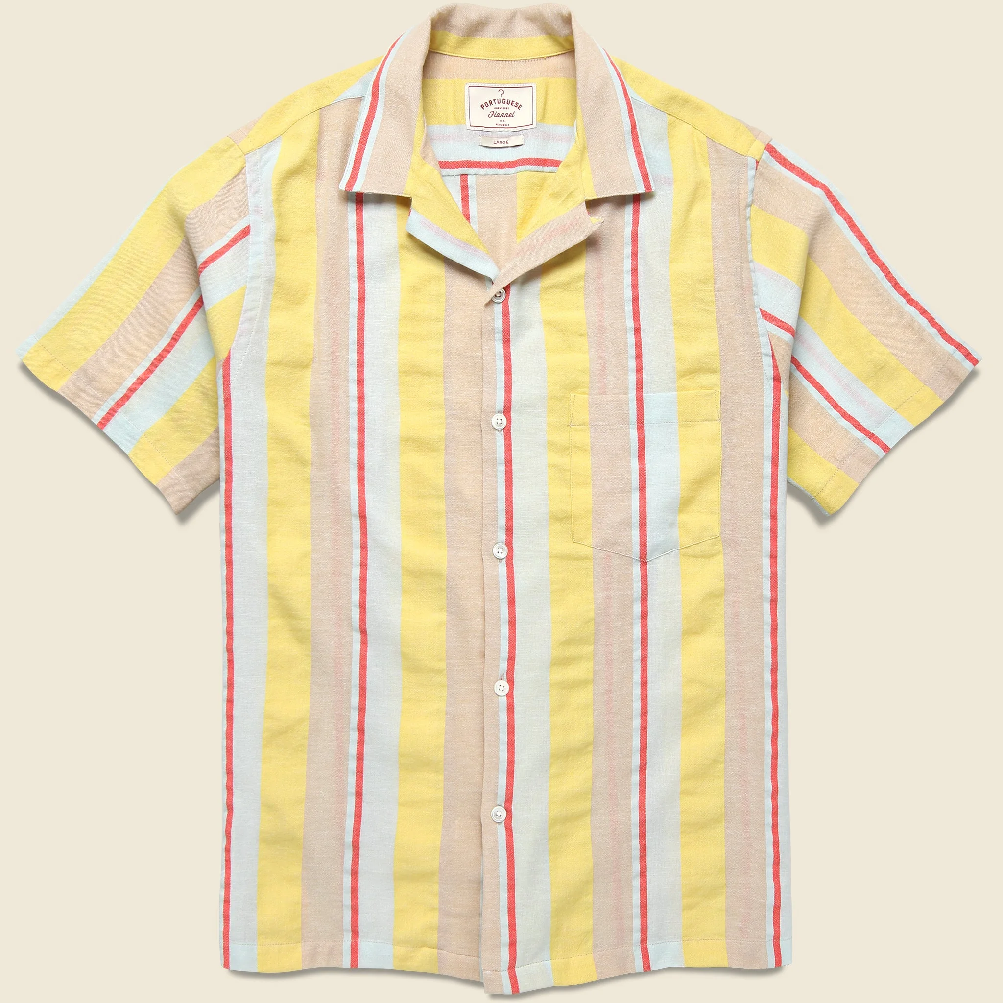 This Striped Boat Camp Shirt from Portuguese Flannel is cut from lightweight, breathable cotton that’s woven with a vertical striped pattern that’s vacation ready. It has a perfectly relaxed, comfortable fit that runs true to size and comes finished with an open camp collar, a single pattern match chest pocket, and a straight hem to complete the vacation shirt look. - Lightweight, breathable cotton - Woven vertical stripe pattern - Mother-of-pearl buttons - Camp collar - Single pattern-match chest pocket - Relaxed fit that runs true to size - We recommend taking your normal size Made in Portugal Materials: 100% cotton The following measurements are for size Medium: Chest: 44” | Shoulder: 19” | Sleeve: 19 ½” | Length: 29”