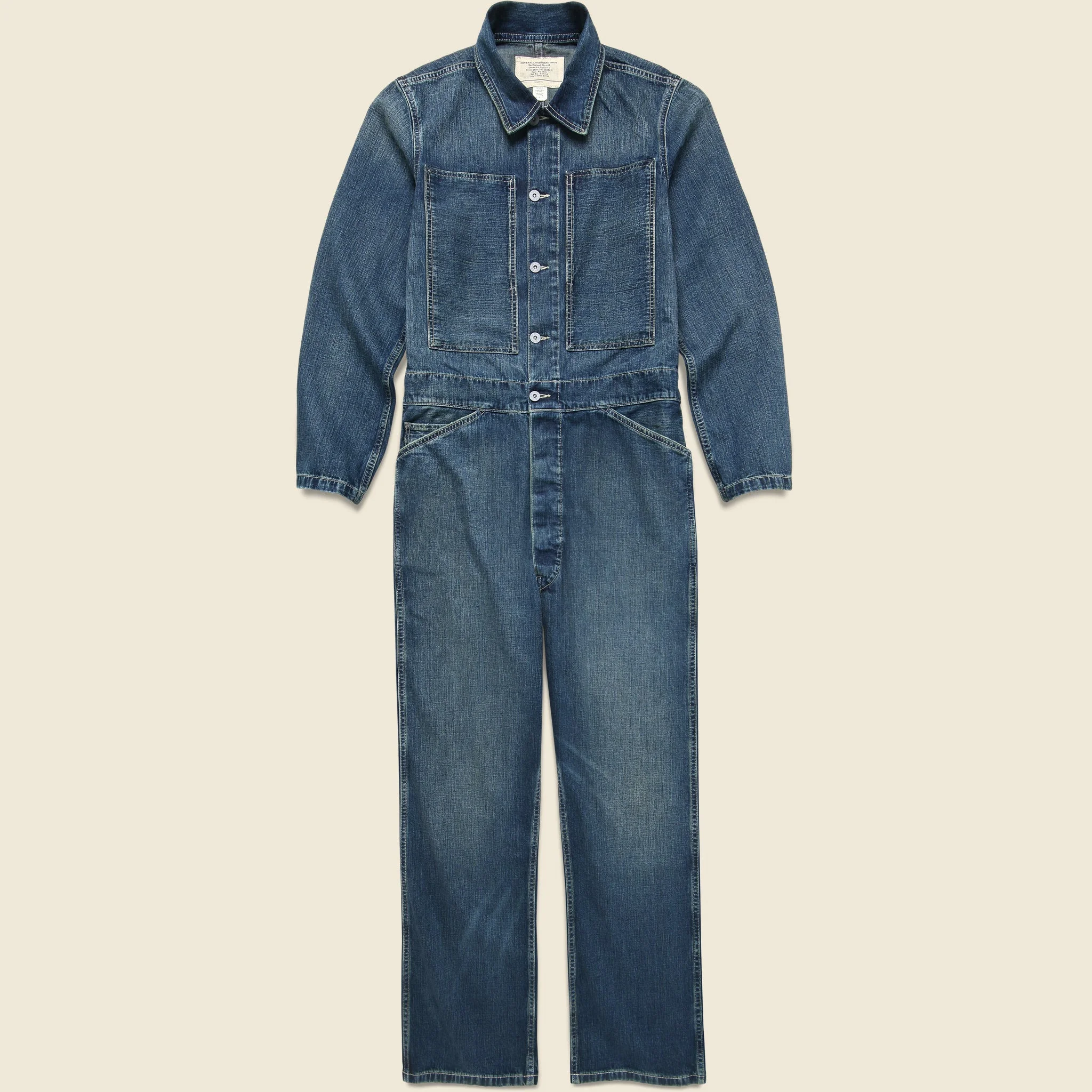 These Denim Coveralls from Double RL are made from a lightweight, 11oz Japanese cotton denim that’s been hand-distressed and specially tinted for a timeworn look and feel from the get. They’re tailored with a classic, relaxed-fitting silhouette that runs true to size and come detailed with American-made metal buttons, a pair of side-entry chest pockets, two front angled waist pockets, two back pockets, and a distressed metal button placket for an authentic, vintage finish. - Lightweight, 11oz Japanese cotton denim - Hand-distressed and specially tinted - Sanforized to minimize shrinkage - Distressed metal buttons - Two side-entry chest pockets - Two angled waist pockets - Adjustable buckled back - Two back patch pockets - Relaxed fit that runs true to size - We recommend taking your normal size Materials: 100% cotton The following measurements are for size Medium: Chest: 42” | Shoulder: 17” | Sleeve: 34” | Top Length: 22 ½” | Waist: 38” | Inseam: 30” | Thigh: 12” | Leg Opening: 18” | Rise: 16”