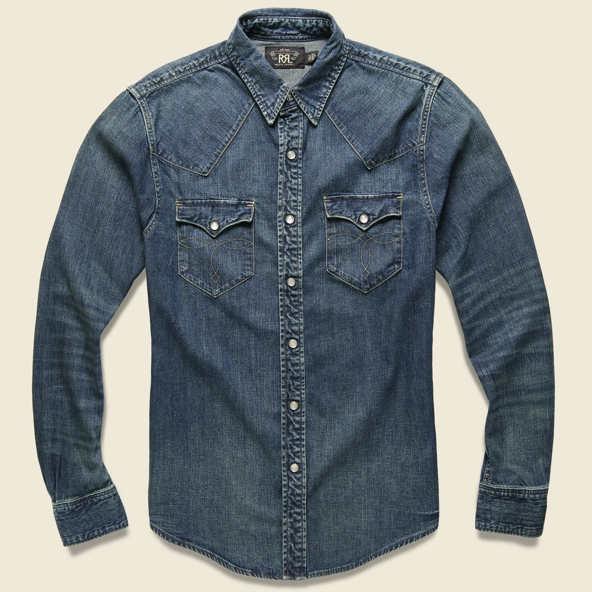 Our best-selling shirt of all-time, the Slim Fit Denim Western from RRL is made from premium Japanese denim & triple-needle chain-stitched for superior durability. Washed for a vintage look & feel, it's finished with custom, Japanese high-rim snaps -- because every detail counts. This one will last you a lifetime & never go out of style. This shirt runs about 1/2 size small, so we recommend sizing up one size from your usual shirt size. - Japanese denim shirt - Washed for a soft feel and a vintage look - Point collar - Applied snapped placket with high-rim snaps - Snapped flap pockets at the chest feature a western boot stitch - Snapped barrel cuffs with a multi-stitched reinforced inner cuff - Curved hem - Western-seamed yoke and shoulders - Slim fit through the chest and sleeve - Runs about 1/2 size small - We recommend sizing up one size from your usual shirt size - See size guide above for measurements on all sizes - 100% cotton