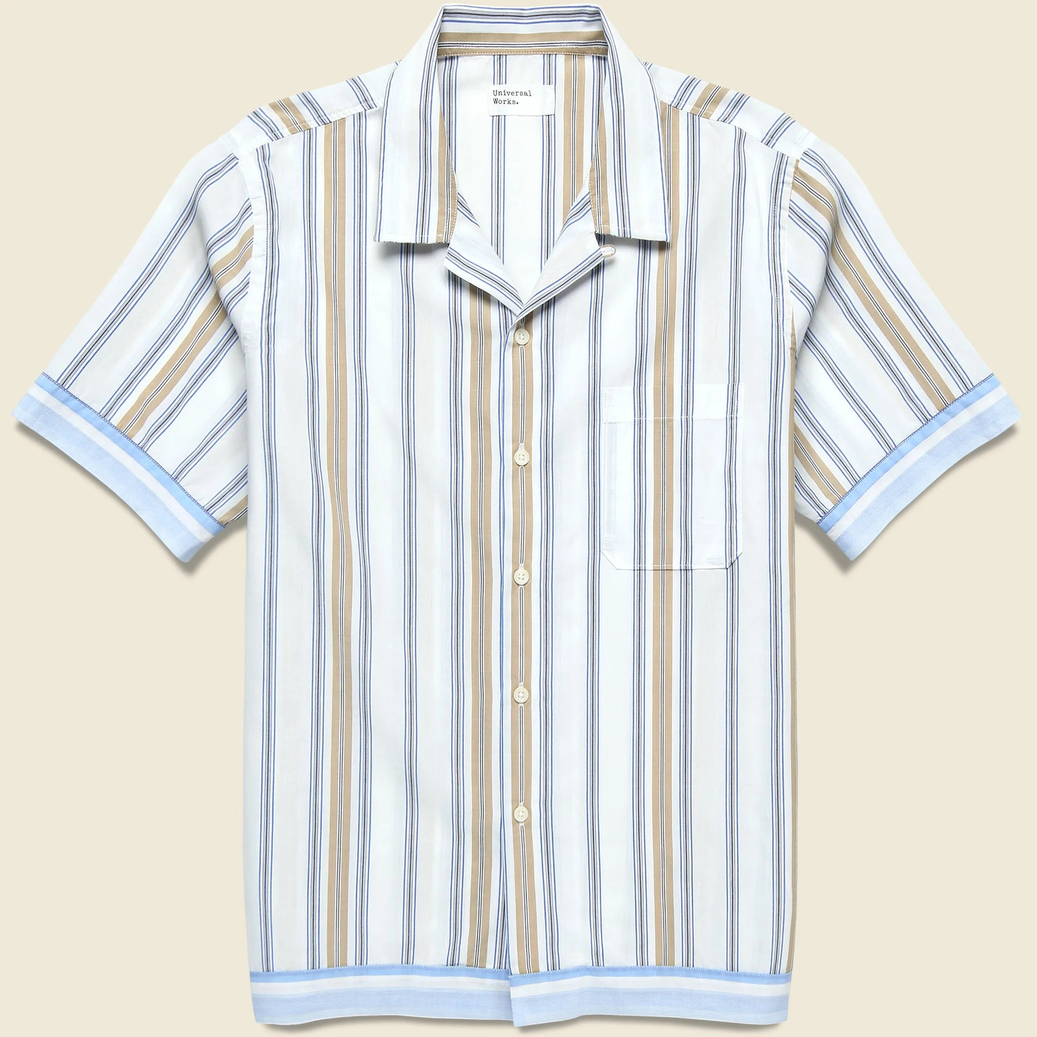 The Dean Stripe Road Shirt from Universal Works is made with lightweight, breezy cotton that’s woven with a classic vertical striped pattern and accented with contrast trim at the cuffs and hem for a vintage-inspired finish. It’s tailored with a traditional fit that runs a touch slim through the shoulder and is detailed with a single, pattern-match chest pocket, mother-of-pearl buttons, and a camp collar for a laid-back 50s look and feel. - Lightweight cotton - Woven vertical stripe - Single chest pocket - Straight hem - Camp collar - Mother-of-pearl buttons - Traditional fit that runs true to size - We recommend taking your normal size Materials: 100% cotton The following measurements are for size Medium: Chest: 42” | Shoulder: 16” | Sleeve: 18” | Length: 28”